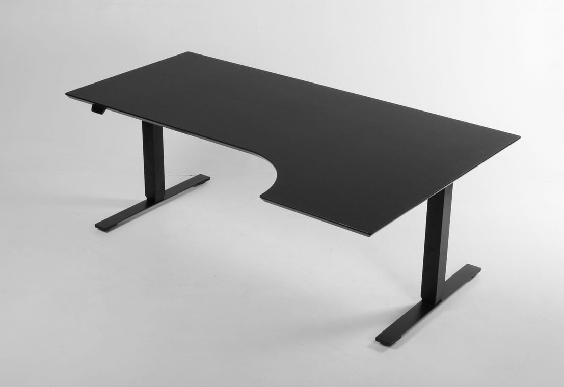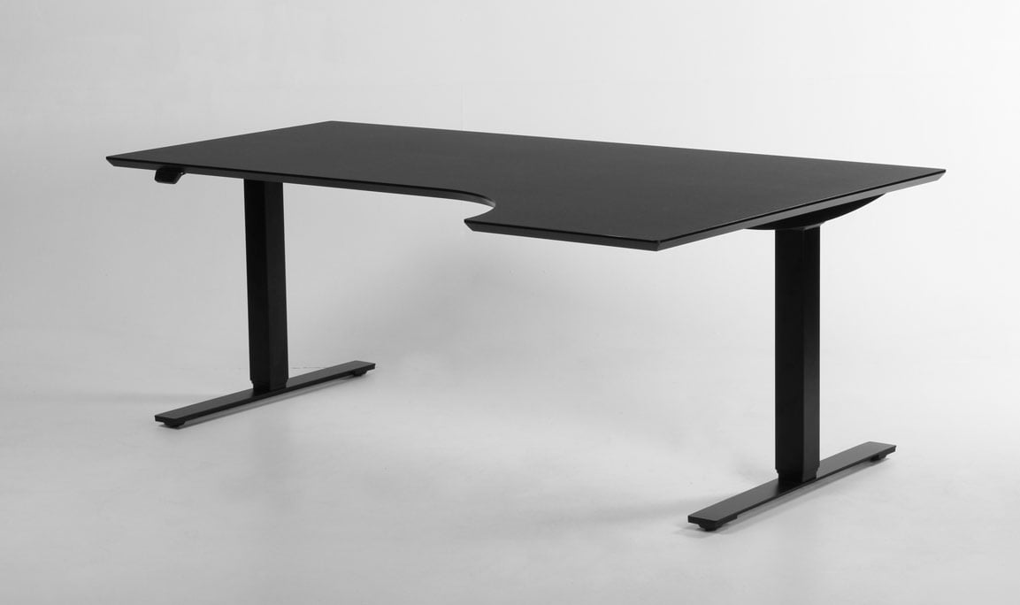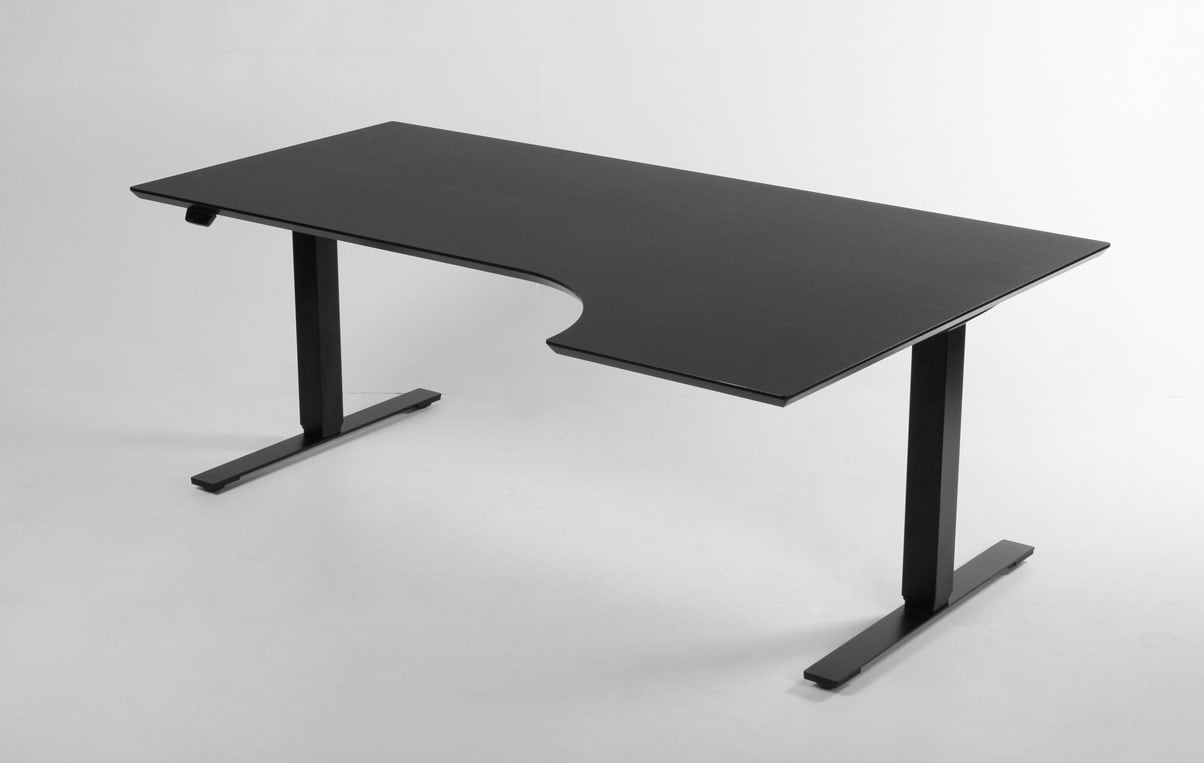 "Dencon Delta hæve-sænkebord med sort linoleumsbordplade, højrevendt mavebue og affasede kanter på sort stel.