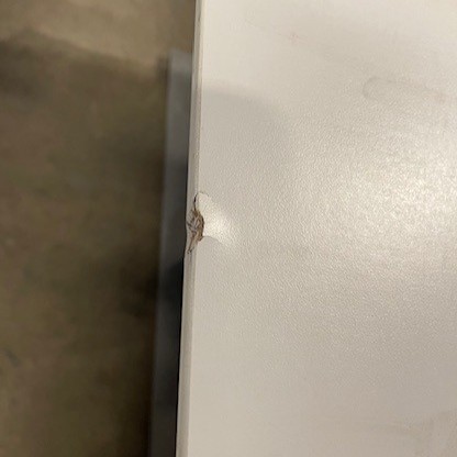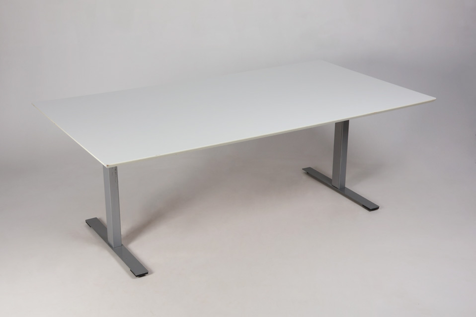"Dencon rektangulært kantine- og konferencebord med hvid laminatbordplade og gråt, robust stel. En fin størrelse mødebord med god plads til tre stole på hver langside.