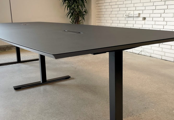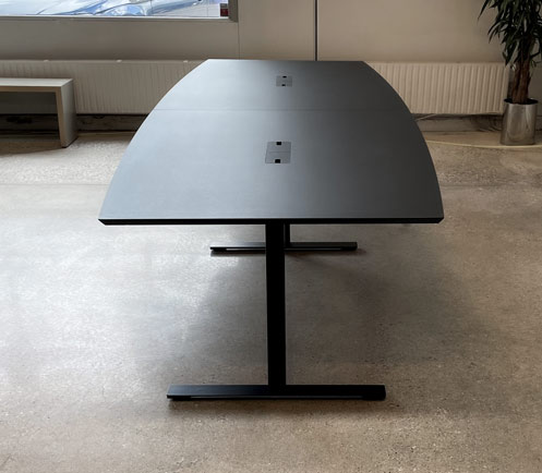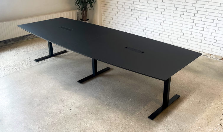 Dencon konferencebord med plads til 10-12 personer, alt efter stolebredde. Sort linoleumsbordplade med sort stel i pulverlakeret stål og kabellemme med strømforsyning.