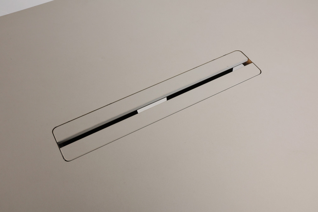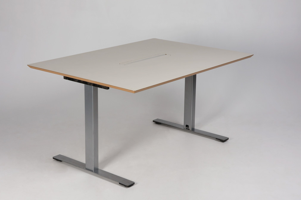 "Mindre mødebord fra Dencon, der passer til fire mødedeltagere. Bordet har beige linoleumsbordplade og er monteret på et gråt robust stel med stilleskruer under fødderne. Centreret i bordpladen er en kabellem, så strømforsyning til brug under mødet, kan gemmes af vejen.