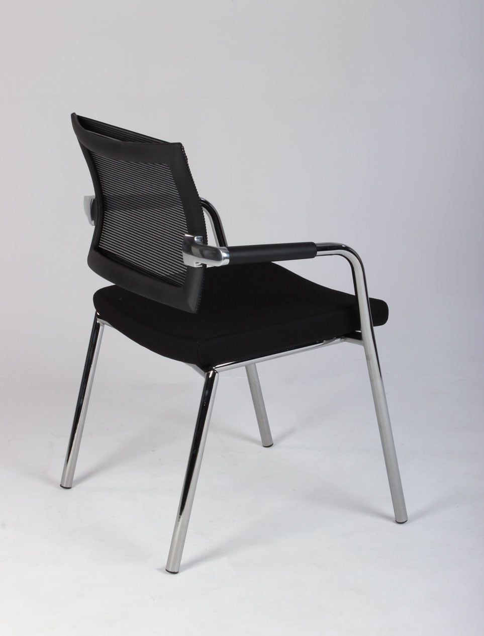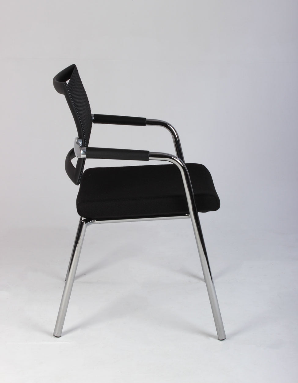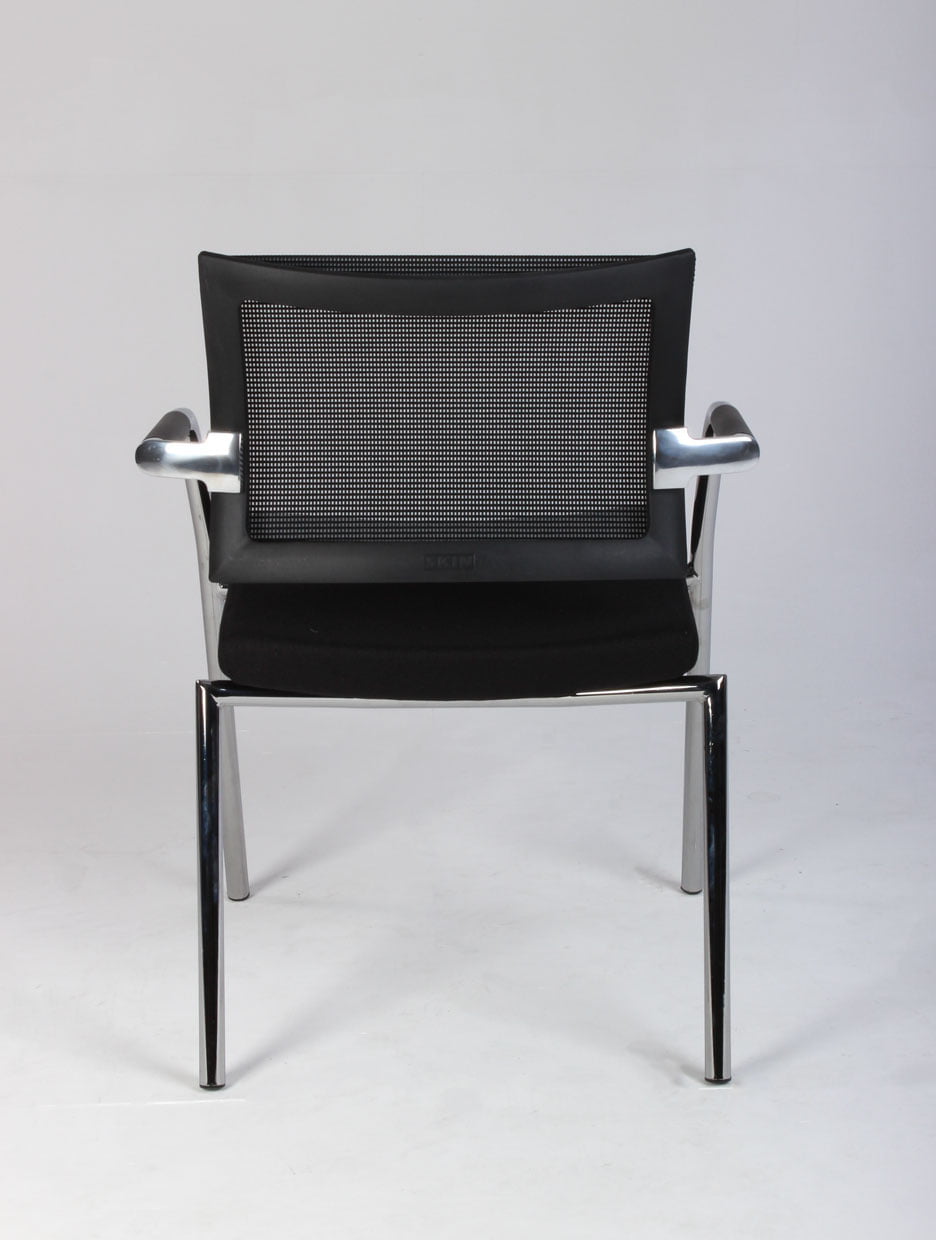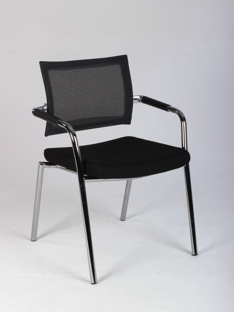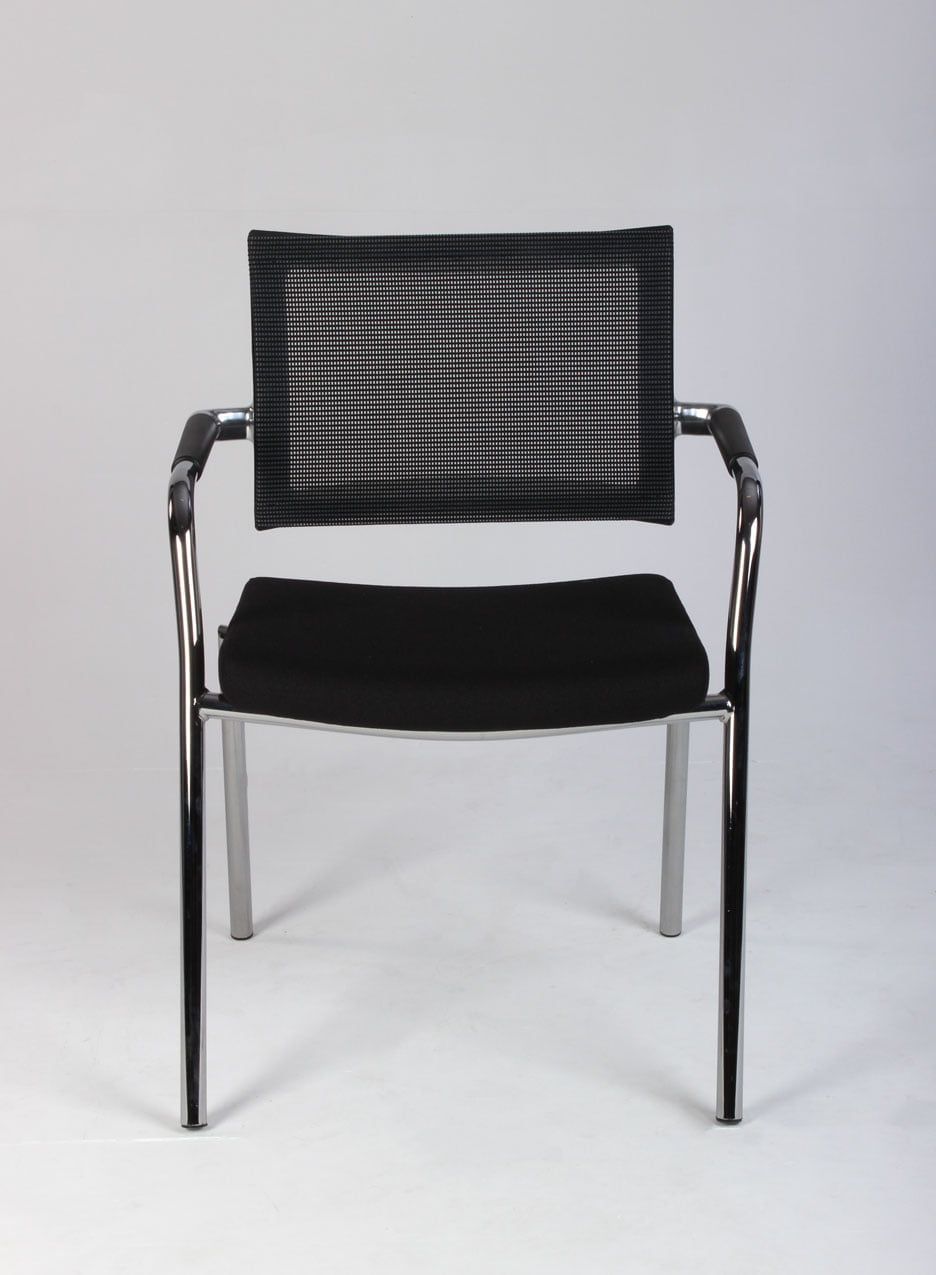 "Fabriksny, stabelbar Dencon Skin konferencestol med armlæn og sædebetræk i sort xtreme, mesh-betræk i rygstykket samt blankforkromet stel.