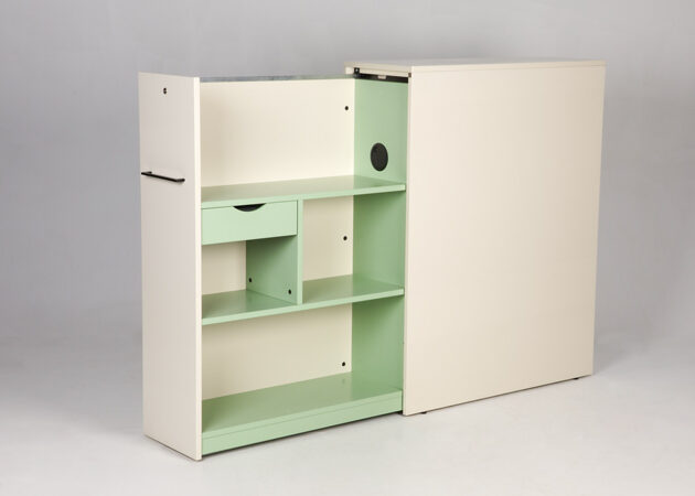 Dencon venstrevendt udtræksskab med nøgle. Korpus i cremehvid laminat med pastelgrønne hylder og skuffe. Den smarte opbevaringsløsning er foruden at kunne rumme alt fra ringbind, brevbakker og kontorartikler, en anvendelig løsning til at adskille arbejdsstationer f.eks. i det åbne kontormiljø.