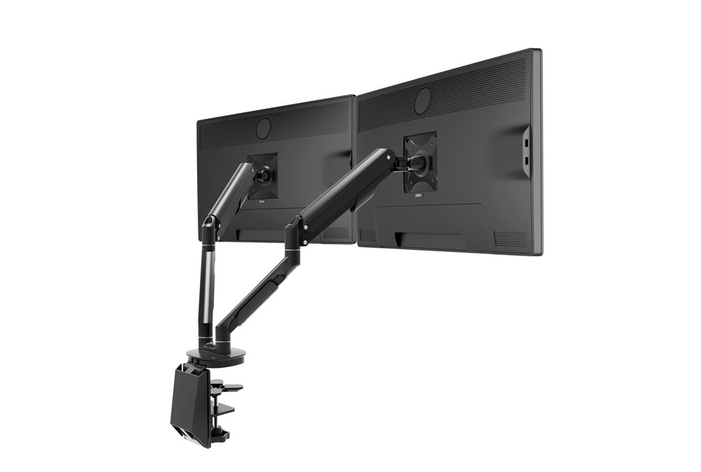 "Sort dobbelt monitorarm med fleksible arme til bordmontering.