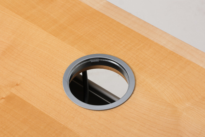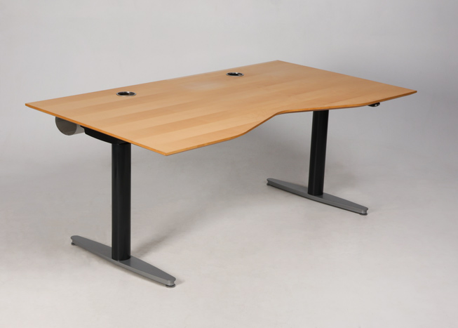 "Duba elektrisk hæve sænkebord med birkefinéret bordplade med centreret, spids mavebue og kabelgennemføringer. Sort 3-leddet stel med grå fødder samt to motorer og kabelbakke til samling af ledninger.