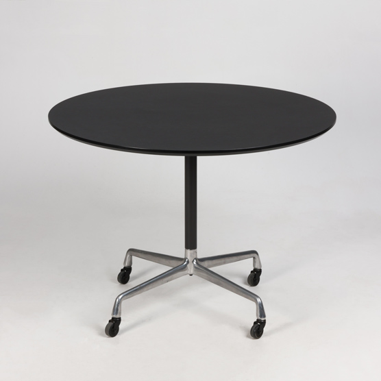 "Upcyclet rundt mødebord med sort fabriksny linoleumsbordplade, på brugt Eames Segmented Table-stel med hjul. Det ikoniske bord med det genkendelige stel, designet af Ray og Charles Eames i 1950’erne, har stilleskruer under fødderne, der sikrer, at bordet står fast og stabilt på et eventuelt ujævnt gulv. Eames Segmented Table er et sofistikeret designbord, der med sikkerhed kommer til sin ret, uanset om det er i spisestuen eller i mødelokalet.