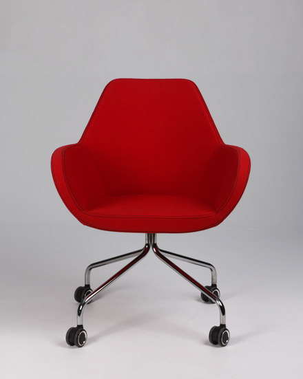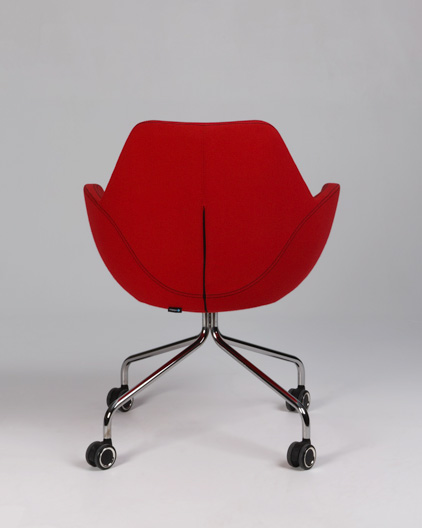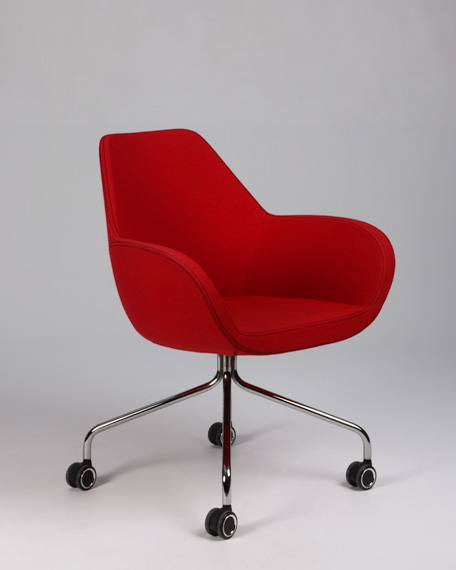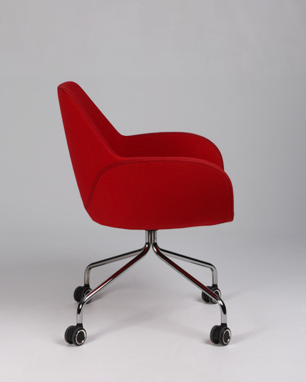 "Edsbyn konferencestol i rød fame med blankforkromet fodkryds og gummibanehjul, til brug på alle gulvtyper.