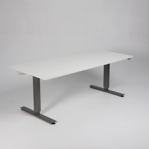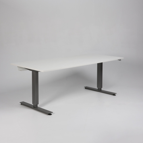 Bordets grå stel har motor i hvert ben og kan hæves fra 66-116 cm. For et flot og funktionelt finish, se vores udvalg af tilbehør i form af bl.a. kabelgennemføring og udtræksskuffer – vi monterer det gratis.