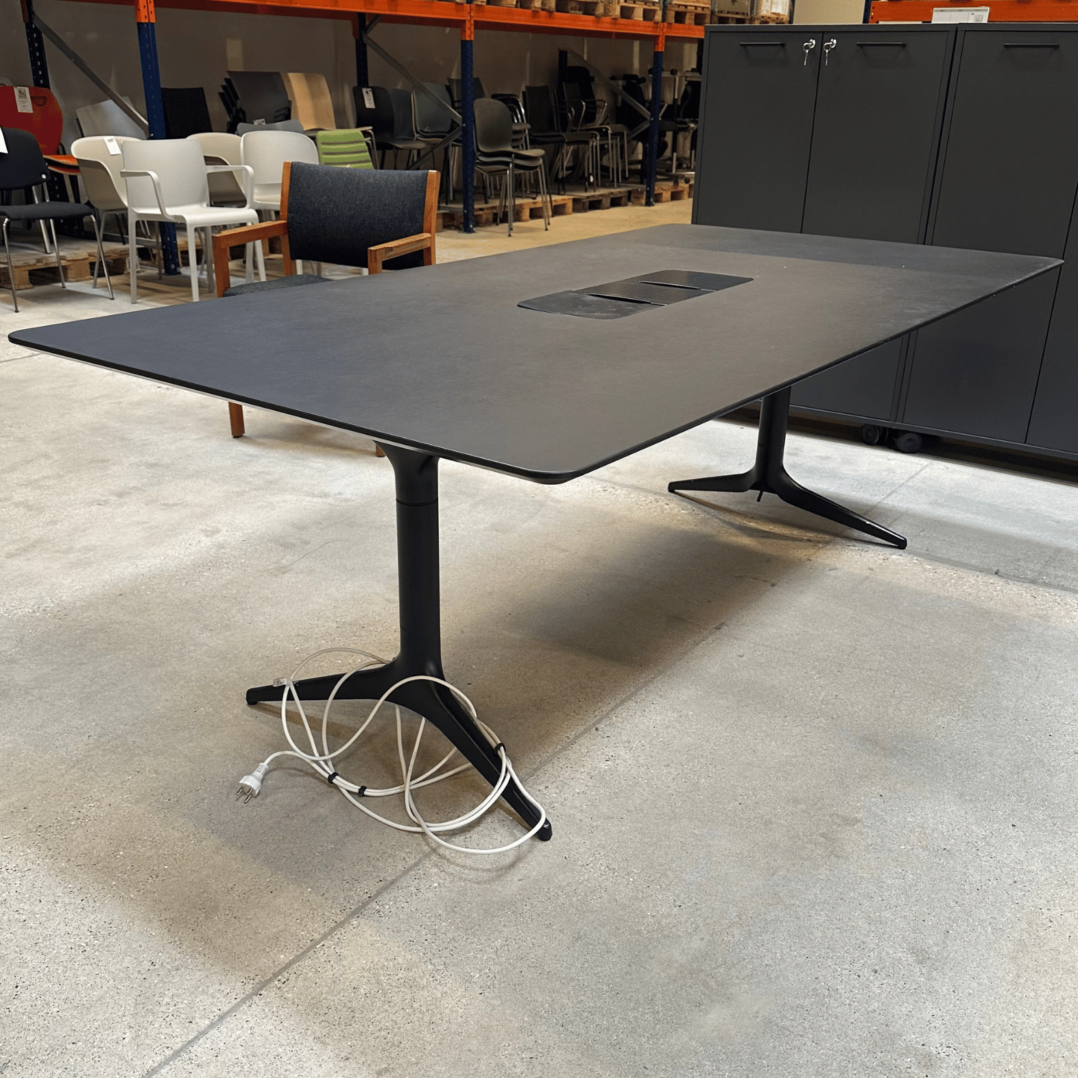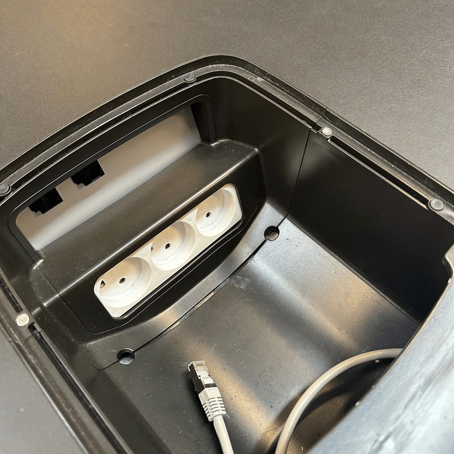 Bordet har en stor kabellem med adgang til strømforsyning og plads til opbevaring af kabler mm.