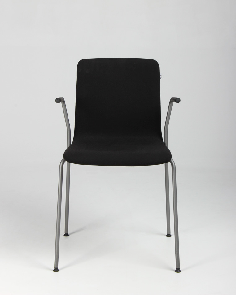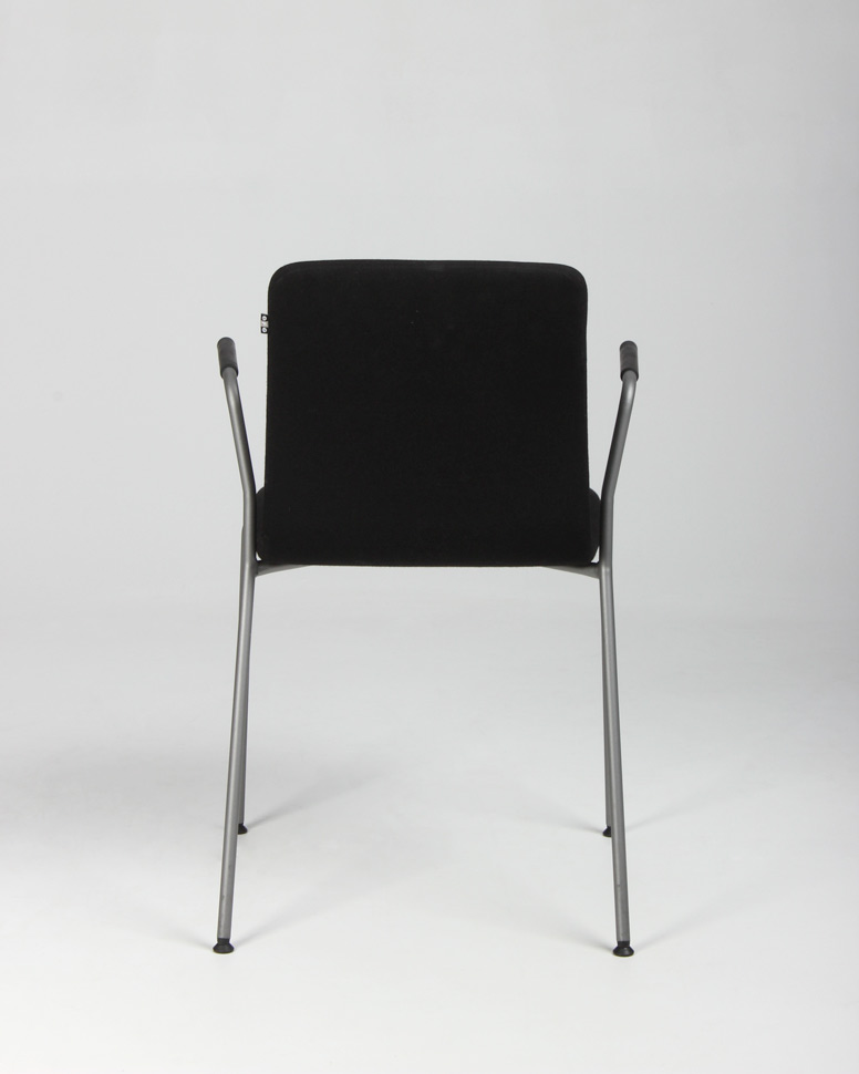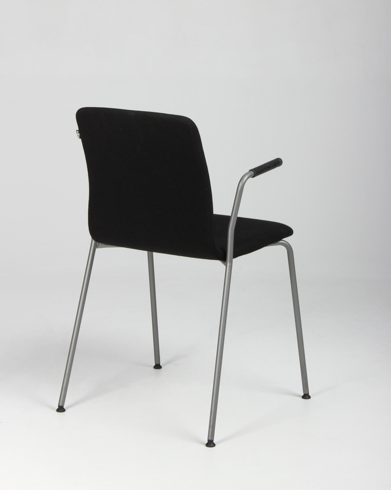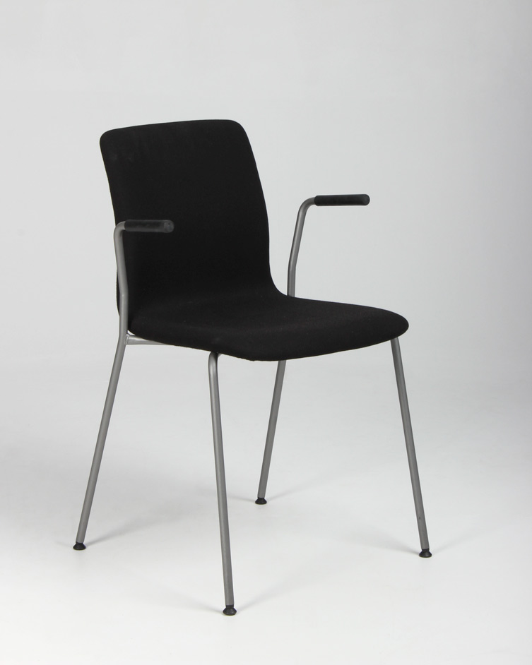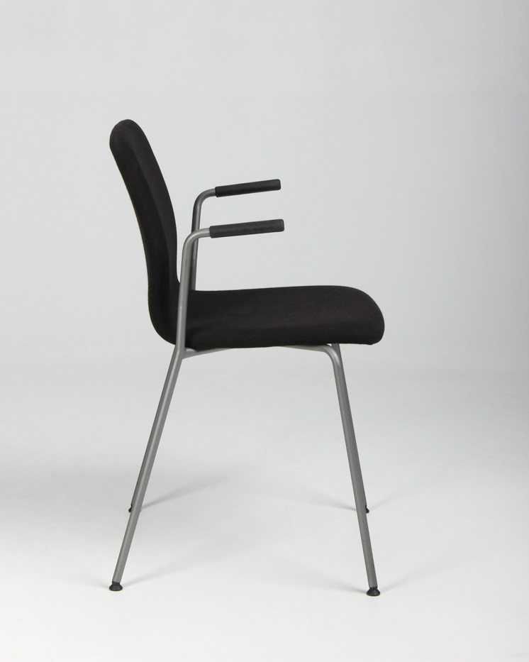 "EFG konferencestol med armlæn, polstret i sæde og ryg og betrukket med sort fame – et slidstærkt møbeltekstil med højt indhold af uld. Pulverlakeret gråt stel med gummibelagte armlæn, der gør det muligt at hænge stolen op på bordkanten i armlænene, så det er nemt at komme til under bordet i forbindelse med rengøring.
