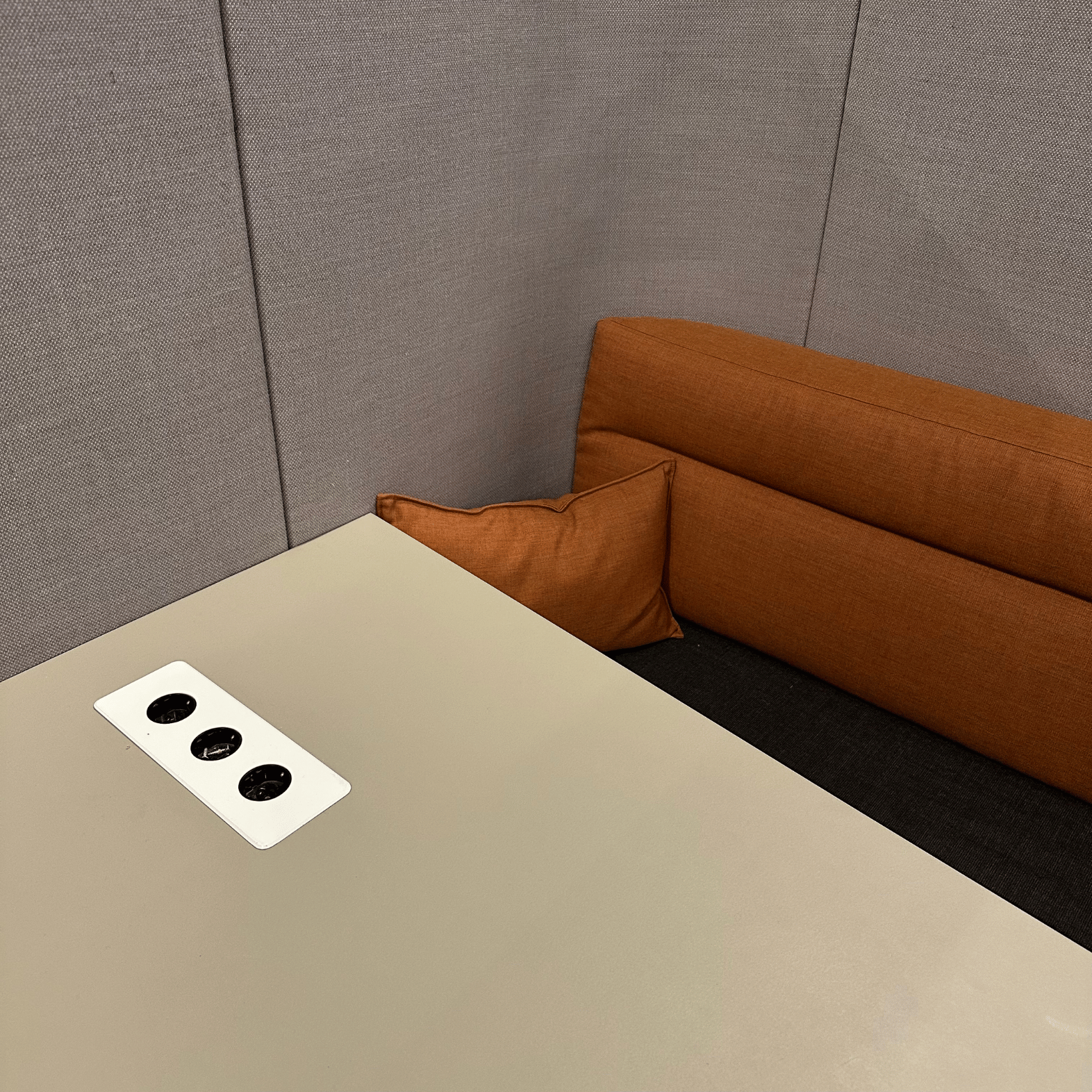 "EFG Surround pod/møderum med integreret bord og vægge fremstillet i et effektivt lyd- og støjreducerende materiale.