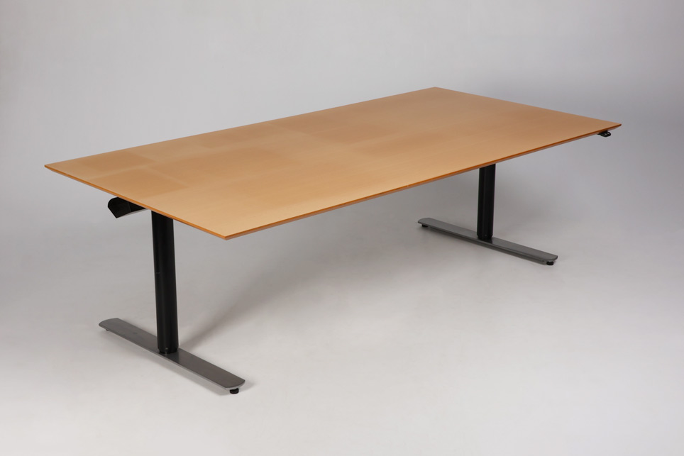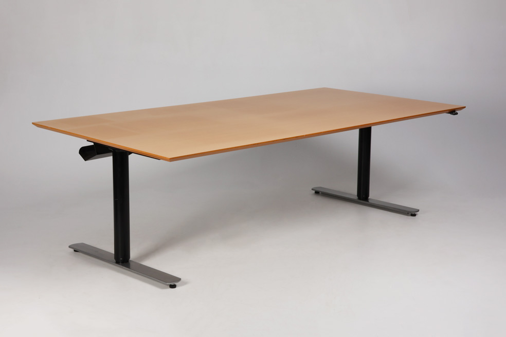 "Stort hæve sænkebord på 200 x 100 cm i bøgefinér. Bordet har Linak styring og kabelbakke monteret.