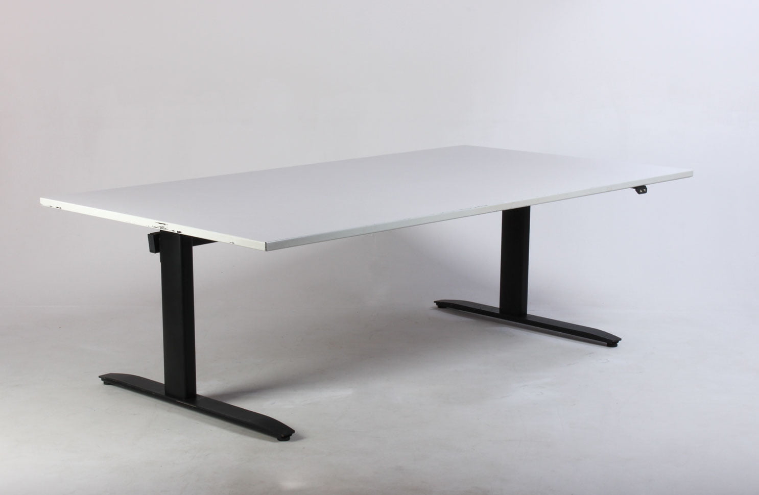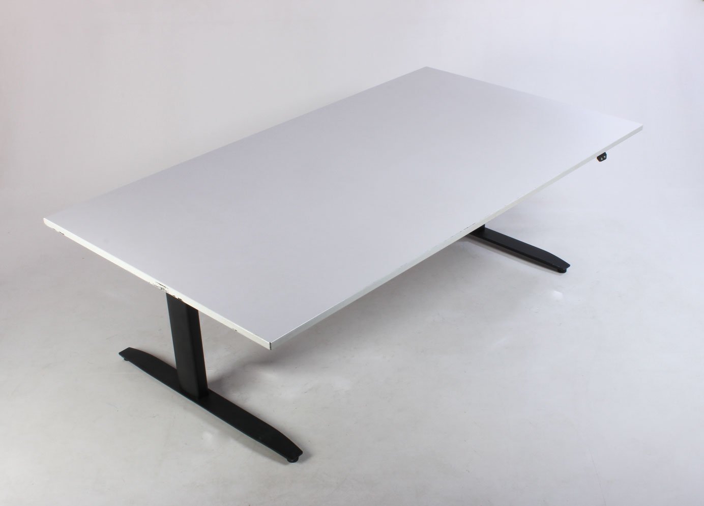 "Linak hæve sænkebord med rektangulær, hvid laminat-bordplade og lige plastkanter.
