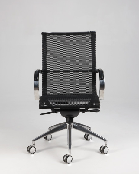 "Emmegi kontorstol i sort med armlæn og fodkryds i poleret aluminium og ryglæn i den åndbare stoftype, mesh.
