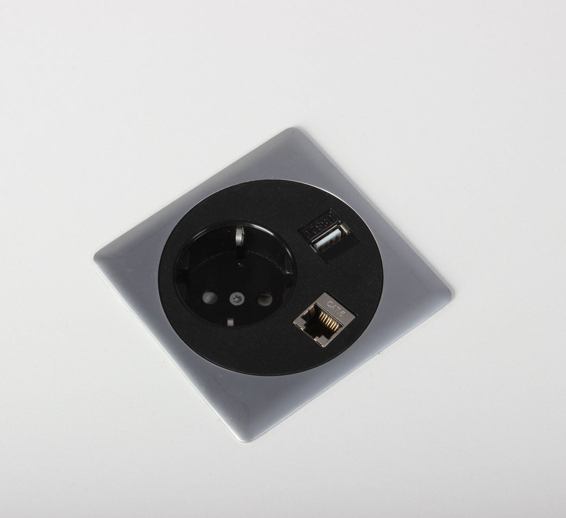 Centreret i bordpladen, er der integreret udtag til strøm, USB og LAN (ethernet) – en smart og praktisk funktion ved afholdelse af møder.