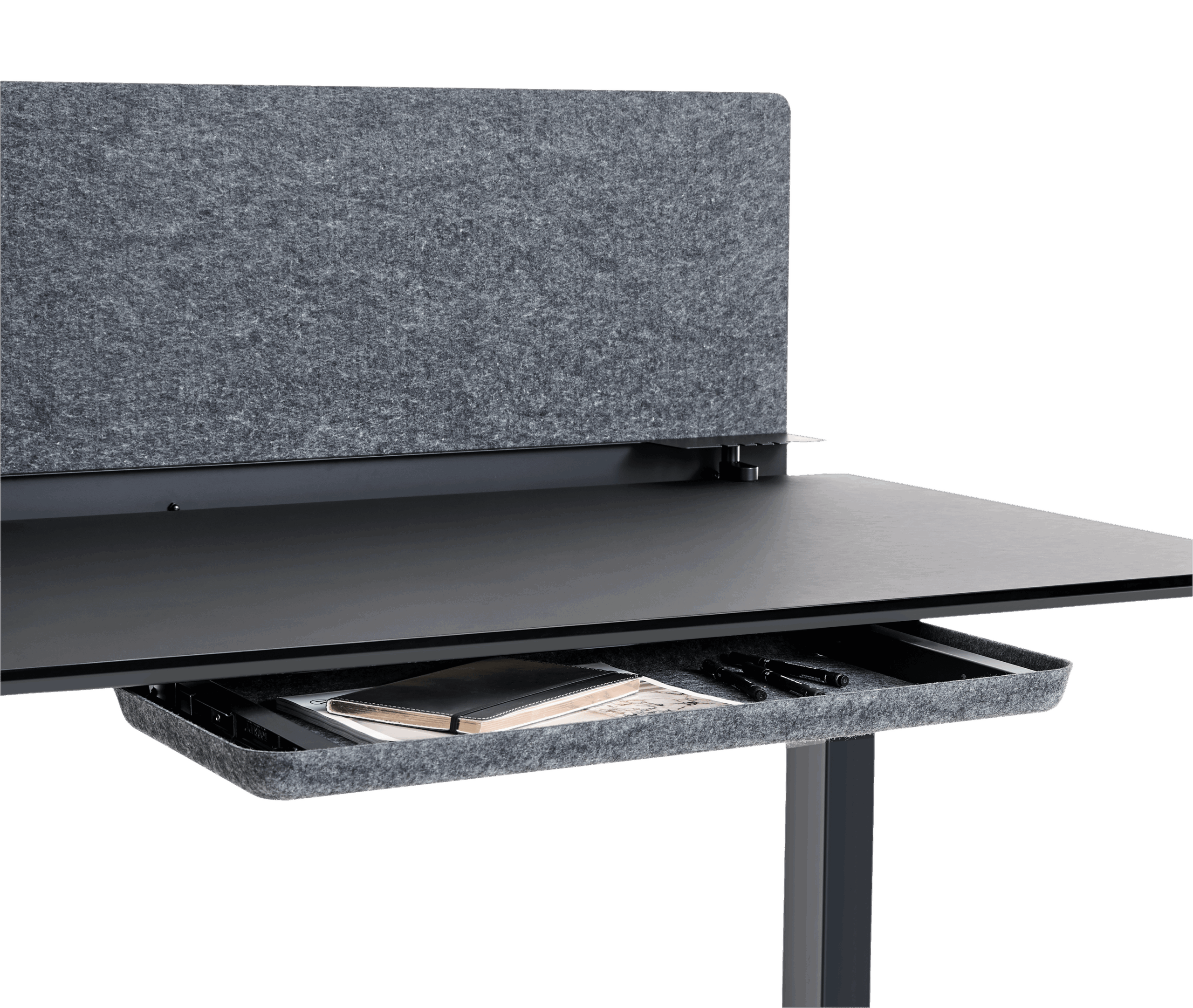 APTO Slim udtræksskuffe til montering under bordpladen på skrive- eller hæve-sænkebordet, til opbevaring af post-its, kuglepenne og andre kontorartikler. Tilkøb evt. en lille indsats til kuglepenne og lignende, så mindre og større kontorartikler kan opdeles. Skuffen er designet med omtanke for naturen – filten er fremstillet af 70% plastflasker fra havene.
