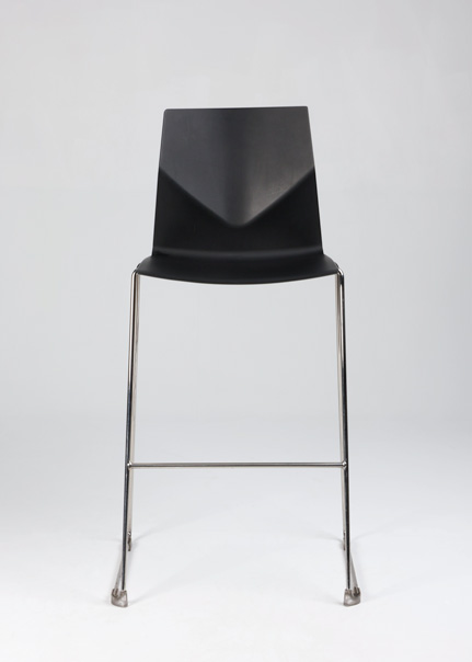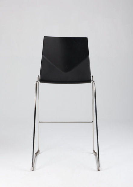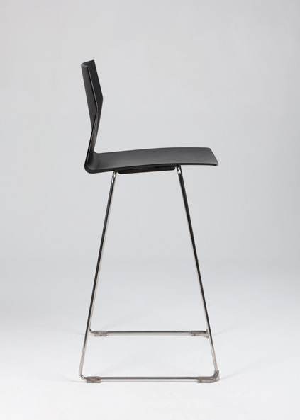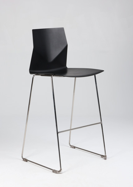 Four Design FourCast stabelbar barstol til kantine eller loungeområde. Stolen har sort formstøbt plastskal med let fleksibelt ryglæn og blankforkromet medestel med fodhviler.