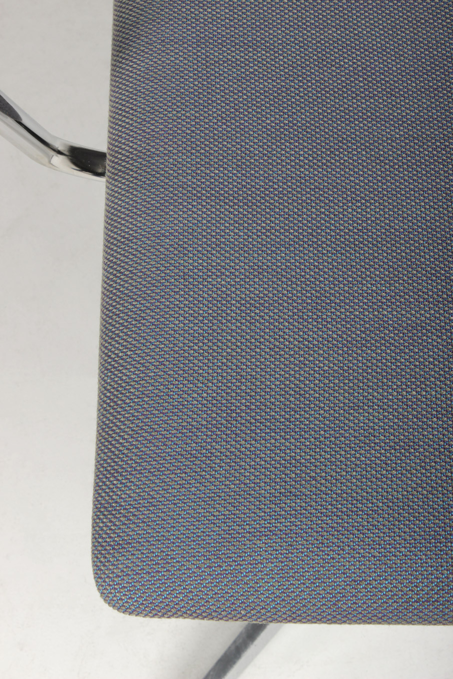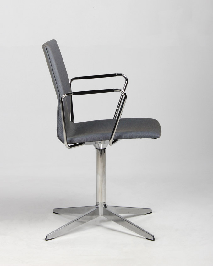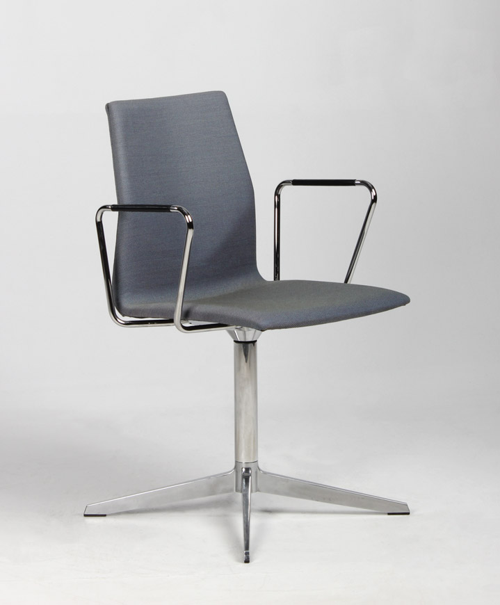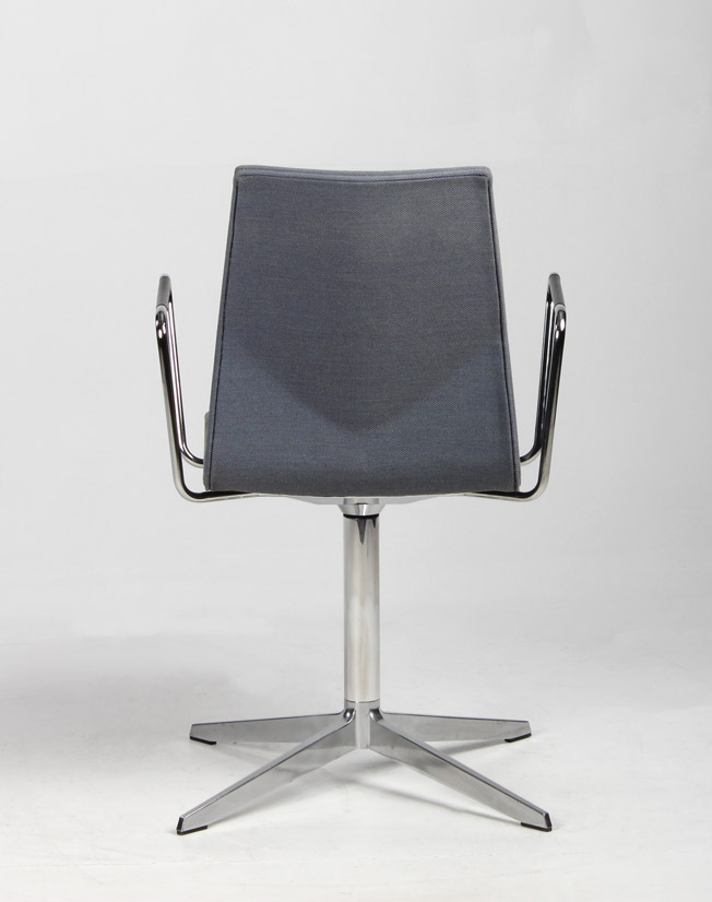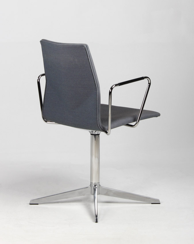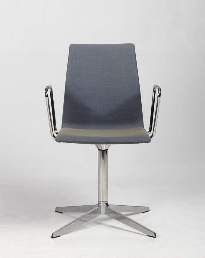 "Four Design FourCast konferencestol i en meleret blågrå nuance, krom armlæn samt drejestel med returdrej – en smart funktion der gør, at stolene omkring mødebordet går i ‘neutral’ position og derved giver et ensartet og pænt udtryk til konferencelokalet, når det ikke er i brug.