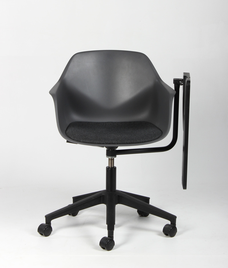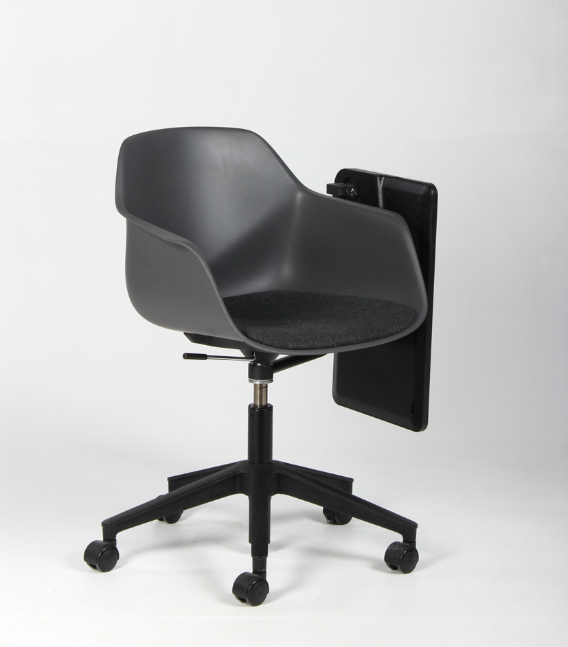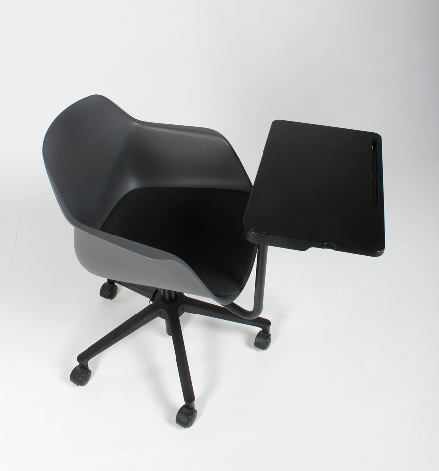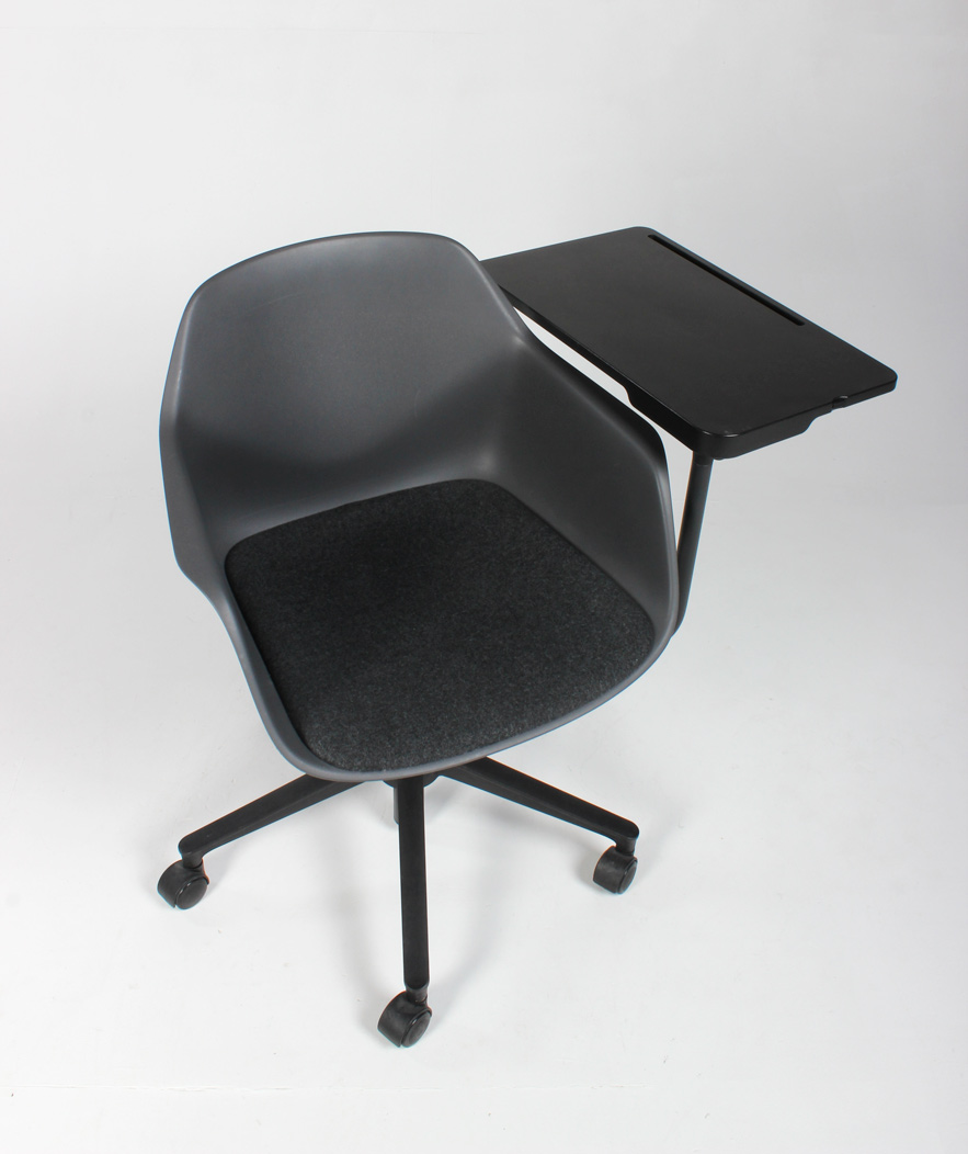 "Four Design FourMe 66 stol med antracitgrå plastskal og sædepolstring med gråmeleret sædebetræk. Stolen er højdejusterbar og har bordplade med kopholder. Ideel til eksempelvis undervisningsbrug.