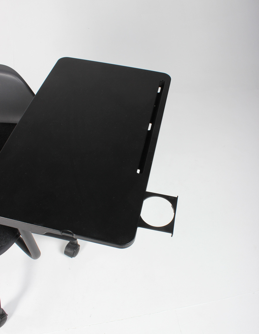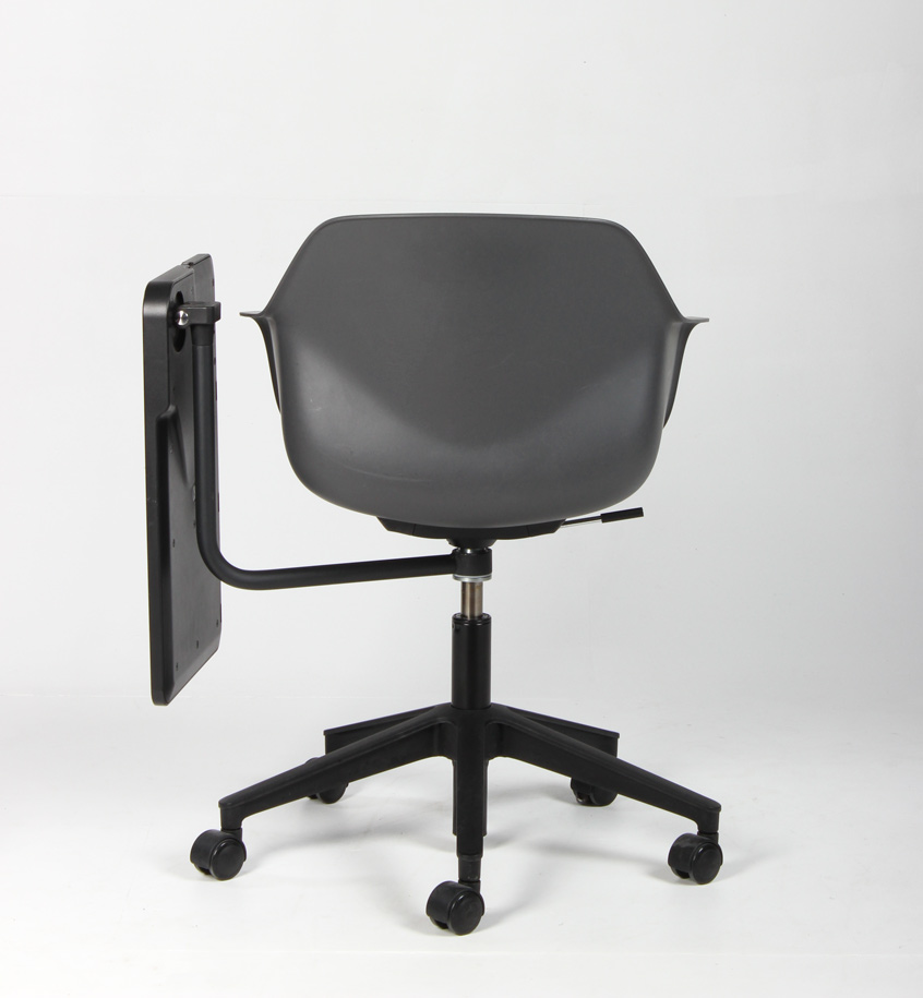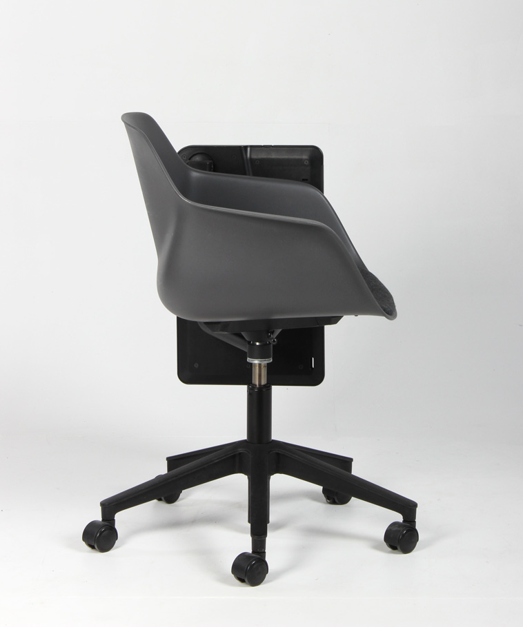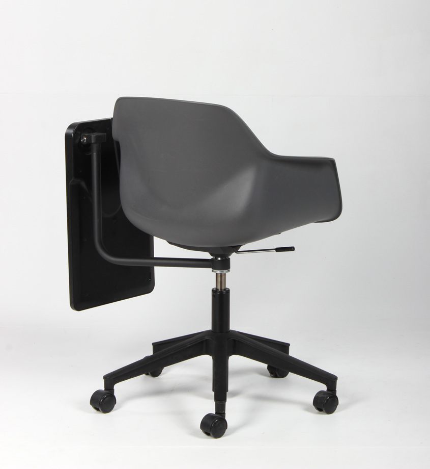"Four Design FourMe 66 stol med antracitgrå plastskal og sædepolstring med gråmeleret sædebetræk. Stolen er højdejusterbar og har bordplade med kopholder. Ideel til eksempelvis undervisningsbrug.