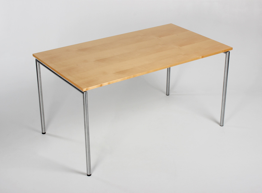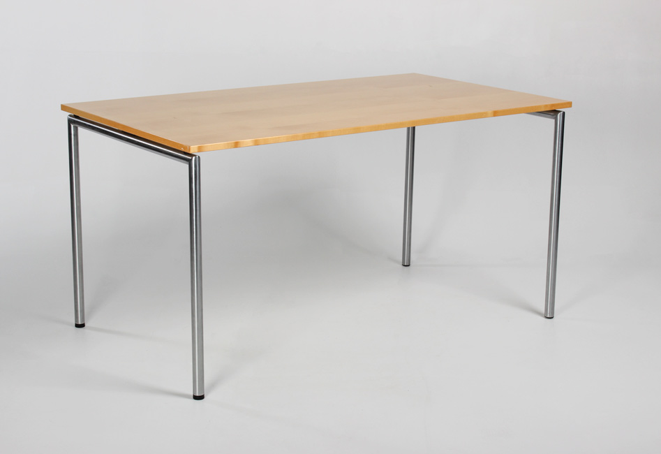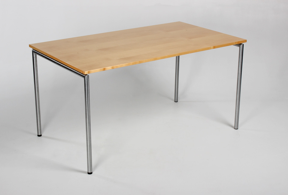 "Four Design klapbord med bordplade i lakeret birkefinér og stel i børstet stål. Bordet har stilleskruer monteret under to af benene, der sikrer, at bordet ikke vipper på et eventuelt ujævnt underlag. Robust og praktisk kvalitetsbord, eksempelvis til kantinen, det mindre mødelokale eller som ekstra bord ved selskaber.
