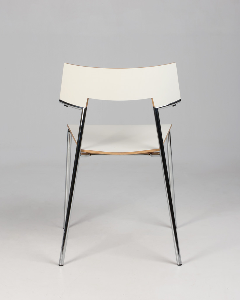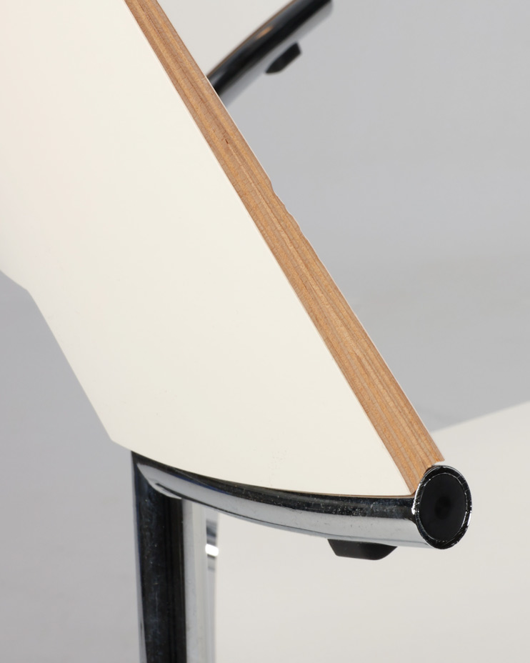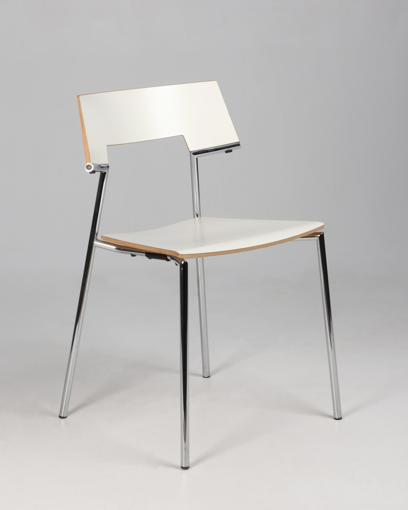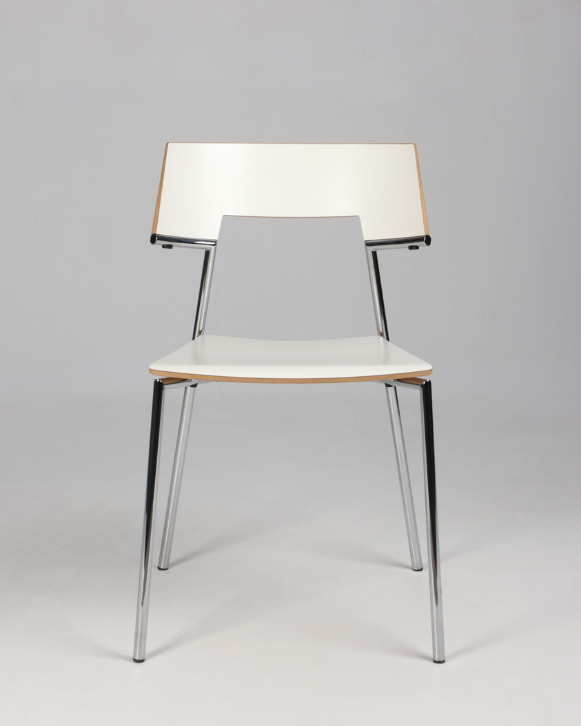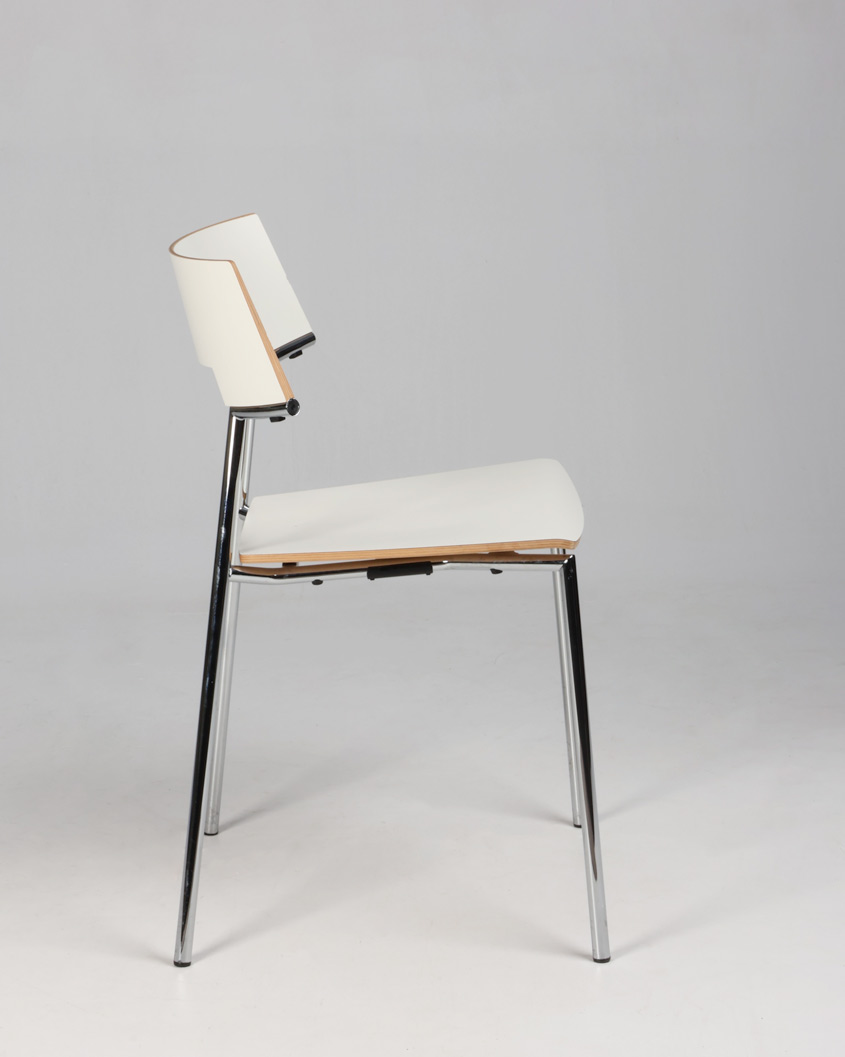 "Four Design Spring stabelstol i hvid laminat og synlig krydsfinérkant samt stel i blankforkromet stål. Stolen fra det danske brand, er et praktisk og rengøringsvenligt valg, og tilfører med den synlige trækant, varme til kantinen eller frokoststuen.