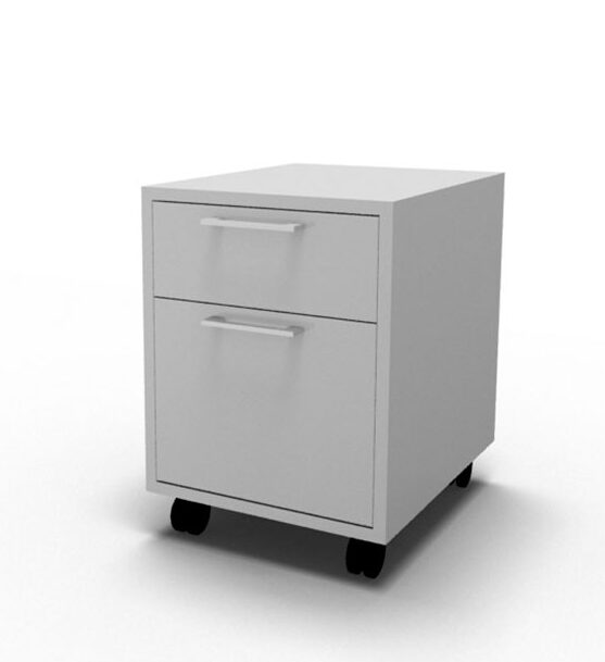 "Fumac Jive skuffekassette med hjul og to skuffer. Fordelingen består af to skuffer – smal skuffe med pennebakke øverst samt skuffe til hængemapper eller anden større opbevaring nederst. Som standard er der lås i øverste skuffe men det er også muligt at købe en skuffekassette med centrallås således at alle skuffer låses på én gang.