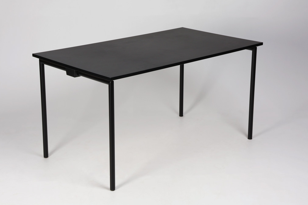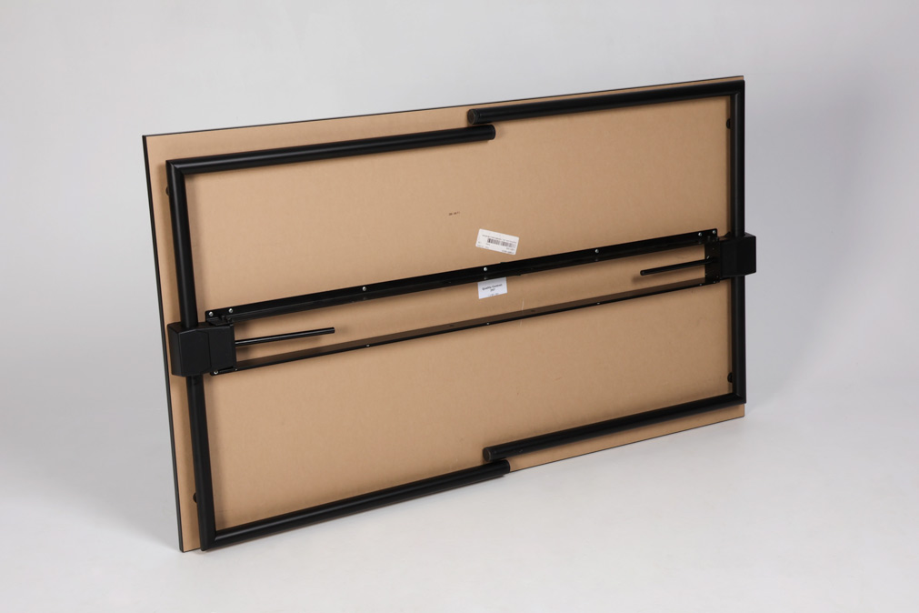 "Fumac klapbord i elegant og robust design. Bordet har sort laminatbordplade pulverlakeret stel med runde ben. Under to af benene er små diskrete hjul, der gør det nemt at flytte ved blot at løfte i den ene ende.
