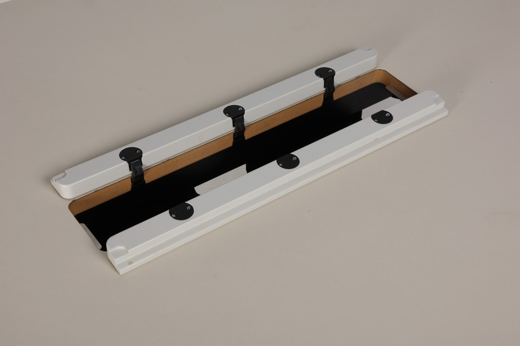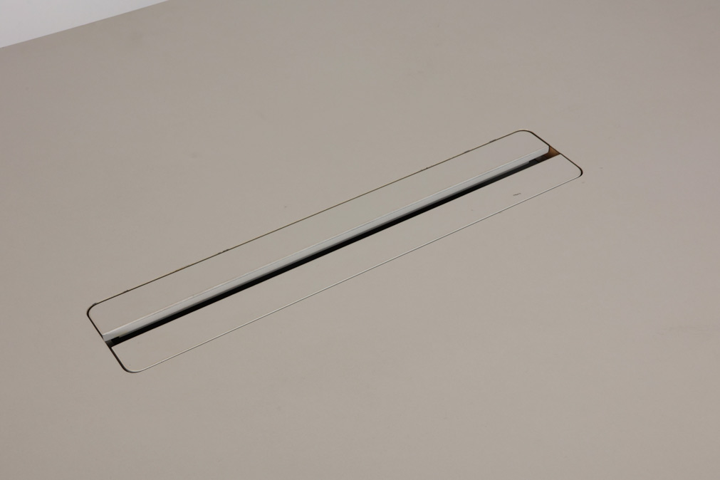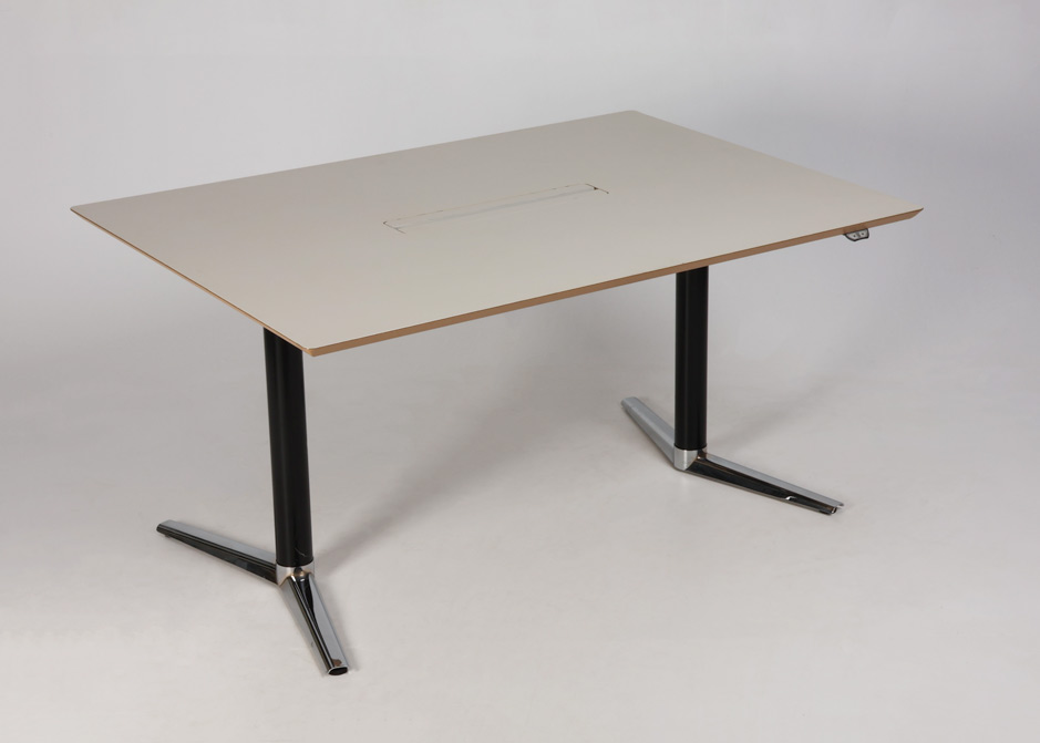 "Flot mindre konferencebord med plads til fire mødedeltagere. Det højdejusterbare elektriske stel, kan hæves til almindelig højde hvortil traditionelle mødestole kan bruges, eller som højbord omgivet af barstole.