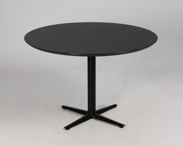 "Fumac Switch mødebord med rund bordplade i sort linoleum. Elegant udformet stel i sort pulverlakeret stål, der kendetegner Switch-serien fra Fumac. Med soklen placeret i midten, er det muligt at placere en ekstra stol, uden et bordben kommer i vejen.