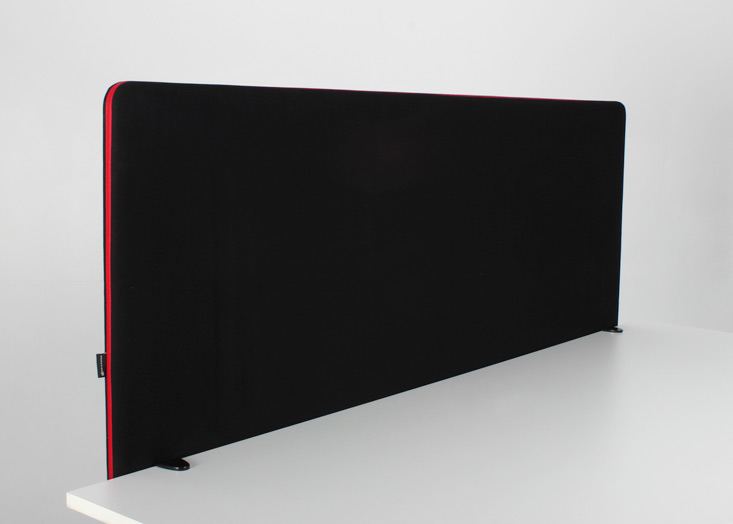 "Götessons bordskærm i sort med rød lynlås til bordplademontering på skrive- eller hæve sænkebordet. Bordskærmen er fremstillet i et effektivt lyd- og støjreducerende materiale og er en god måde, at skabe arbejdsro og diskretion på kontoret – særligt i større og åbne kontormiljøer. Desuden anvendelig som opslagstavle.