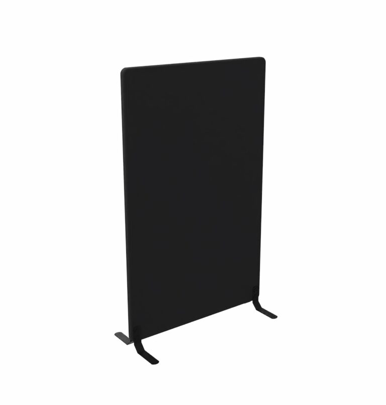 "ScreenIT A30 gulvskærm (uden fødder) i sort Event Screen+ tekstil. Praktisk afskærmningsløsning til fx store kontormiljøer hvor der arbejder mange i samme rum. Gulvskærmen er med til at danne rum i rummet, forbedre akustikken og fungerer også som opslagstavle. A30 er bygget med en indre træramme som danner den grundlæggende form. Heri 30 mm lydabsorberende skum. Skærmen er til sidst polstret med 5 mm skumlamineret stof på begge sider.
