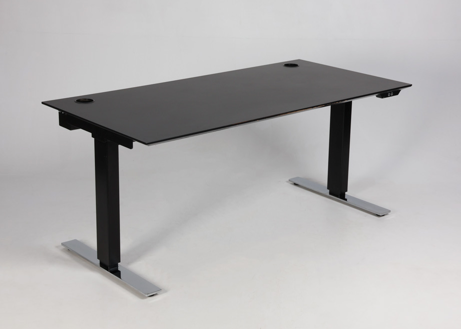 Sort stel med blankforkromede fødder, Linak-styring og to motorer der justerer højden, så det nemt tilpasses både stående og siddende kontorarbejde. Desuden er monteret en kabelbakke, der samler og holder orden på kabler fra PC og øvrigt elektronisk udstyr.
