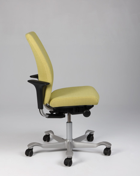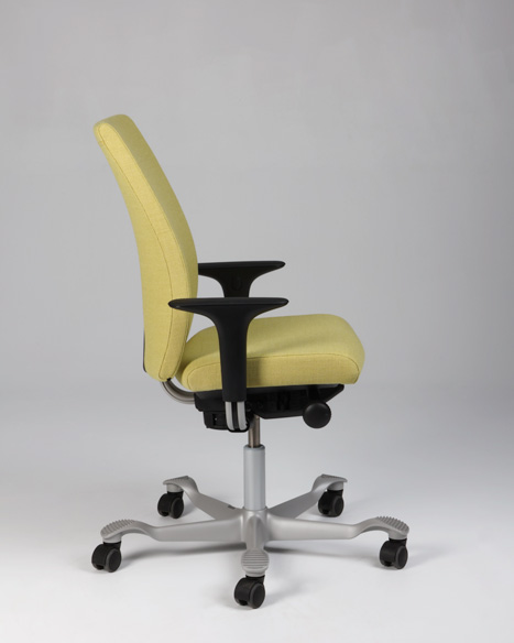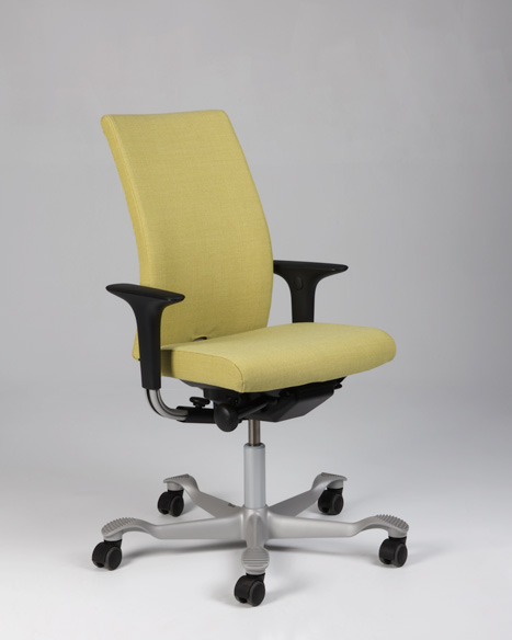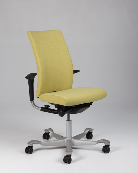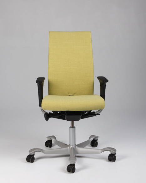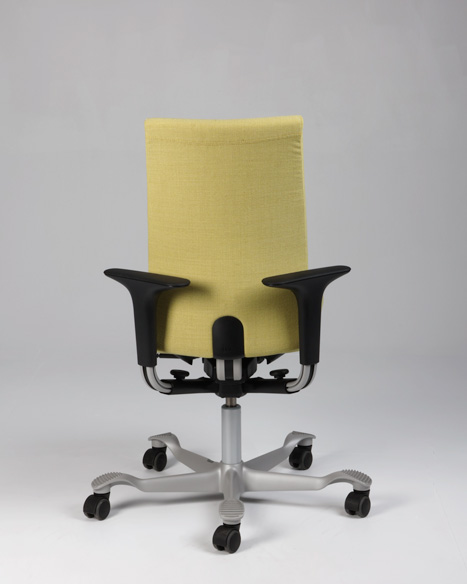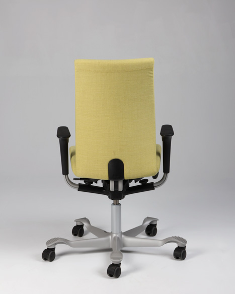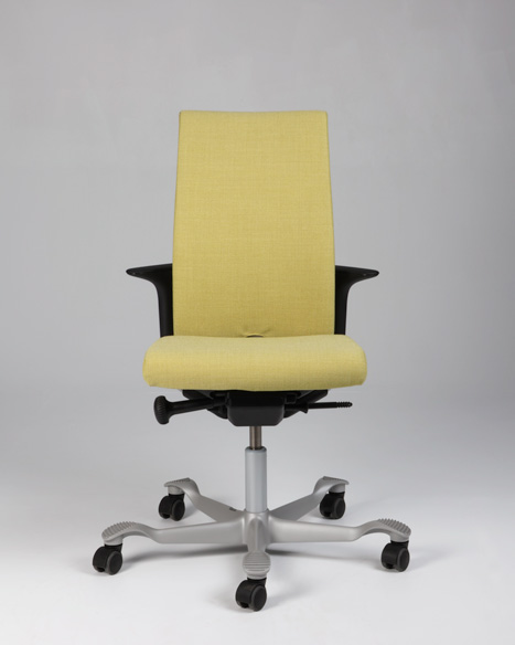 "HÅG Creed 6006 kontorstol i gul uld, Swingback-armlæn og gråt fodkryds med gummibanehjul. Stolen har flere funktioner – heriblandt justerbar sædedybde og HÅG in-Balance-system (balanceret, glidende vippefunktion for- og bagover), og kan derved nemt tilpasses den enkelte bruger, for optimal sidde- og arbejdsstilling.