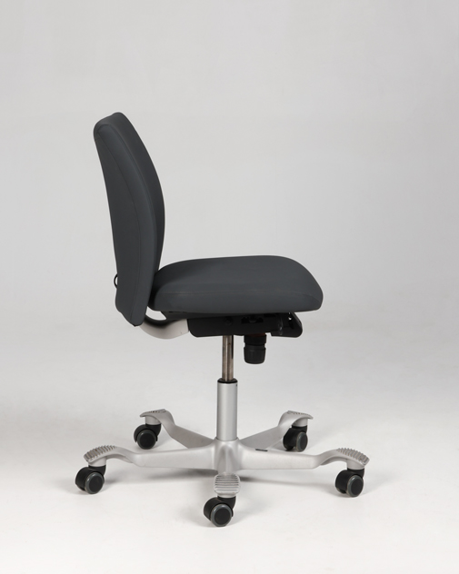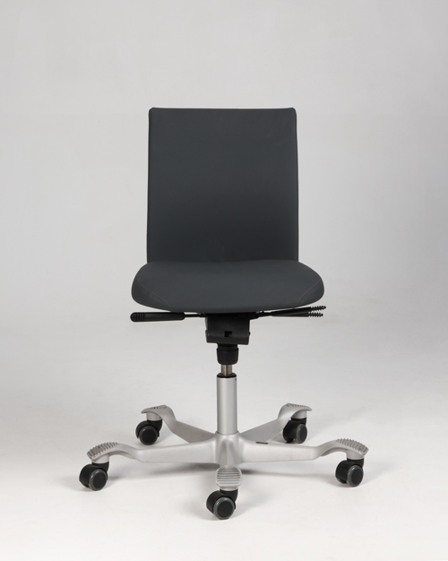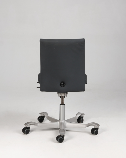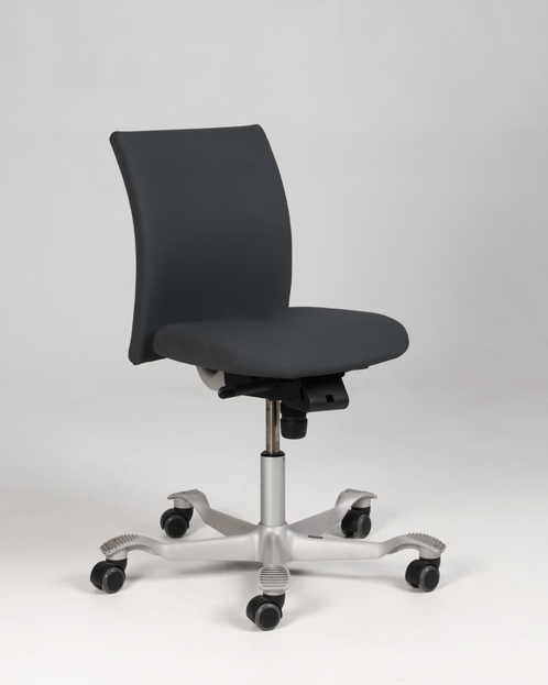 "HÅG H04 4100 kontorstol med betræk i gråt elastisk gummibaseret materiale og mat gråt fodkryds. Denne model har et kortere sæde end standard-modellen samt lav gaslift på 150 mm. Derudover har den funktioner som blandt andet sædedybderegulering, sædevip og højdejusterbart ryglæn, der har til fordel at forbedre den ergonomiske siddestilling og -komfort.