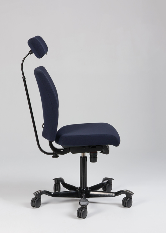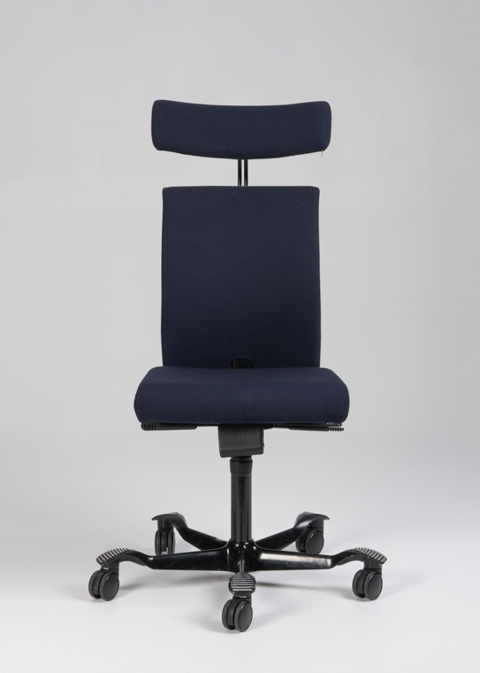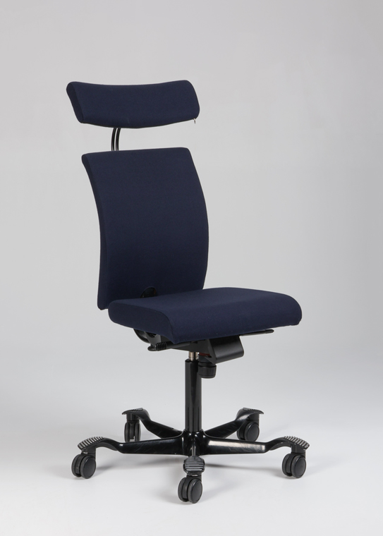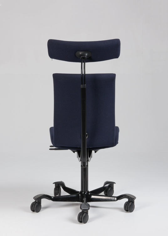 "HÅG H04 4200 kontorstol med nakkestøtte betrukket med mørkeblå fame samt sort aluminiumsfodkryds. Stolen har standard gaslift (200 mm) der passer til de fleste, samt flere har flere funktioner – heriblandt justerbar sædedybde og HÅG in Balance-system (balanceret, glidende vippefunktion for- og bagover), og kan derved nemt tilpasses den enkelte bruger, for optimal sidde- og arbejdsstilling.