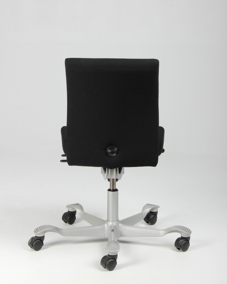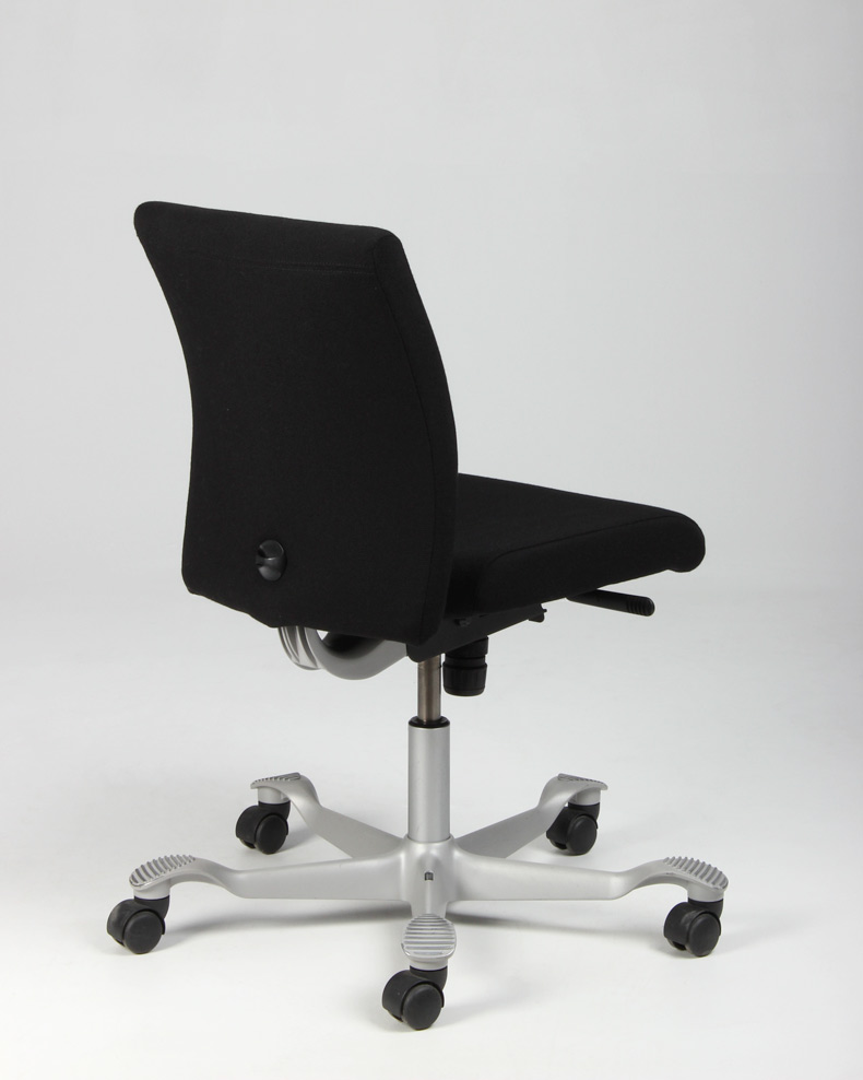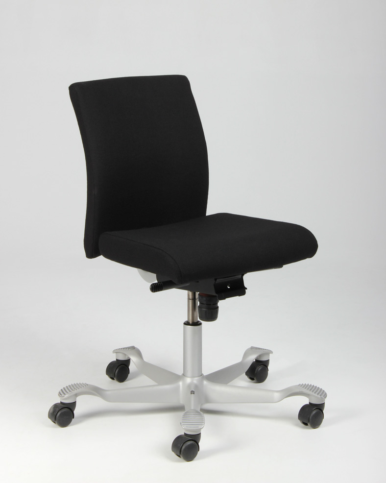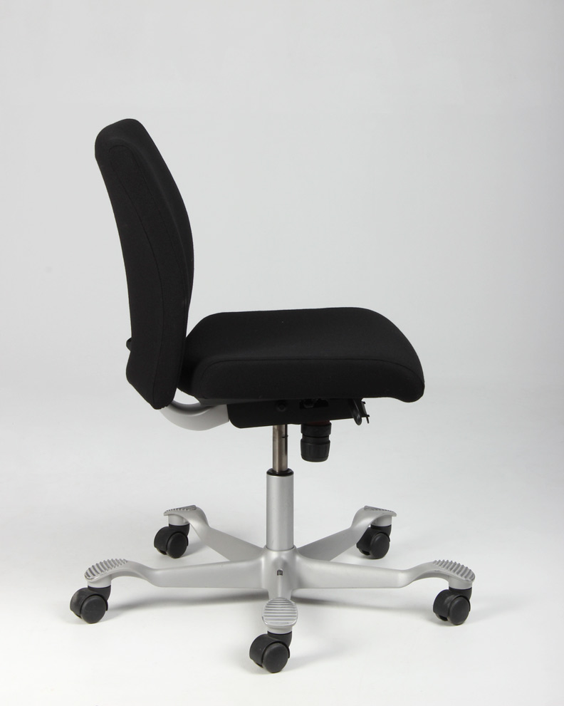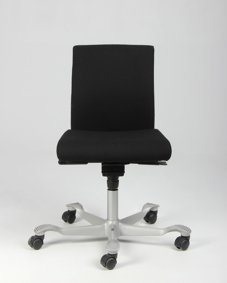 "HÅG H04 4200 kontorstol nybetrukket med sort fame, på brugt aluminiumsfodkryds. Denne udgave har lav gaslift samt har flere funktioner – heriblandt justerbar sædedybde samt HÅG in Balance-system (balanceret, glidende vippefunktion for- og bagover), og kan derved nemt tilpasses den enkelte bruger, for optimal sidde- og arbejdsstilling.