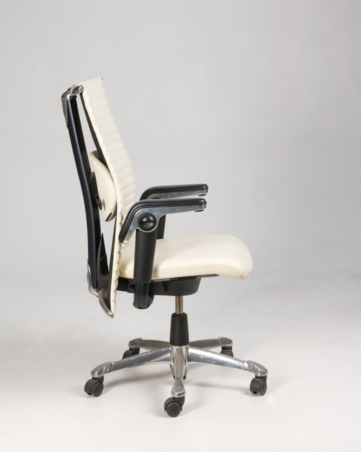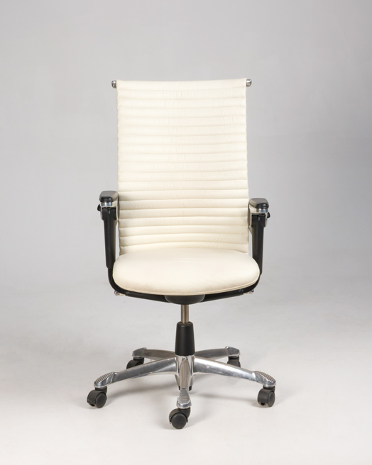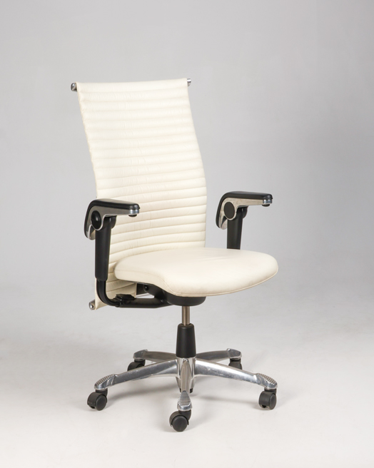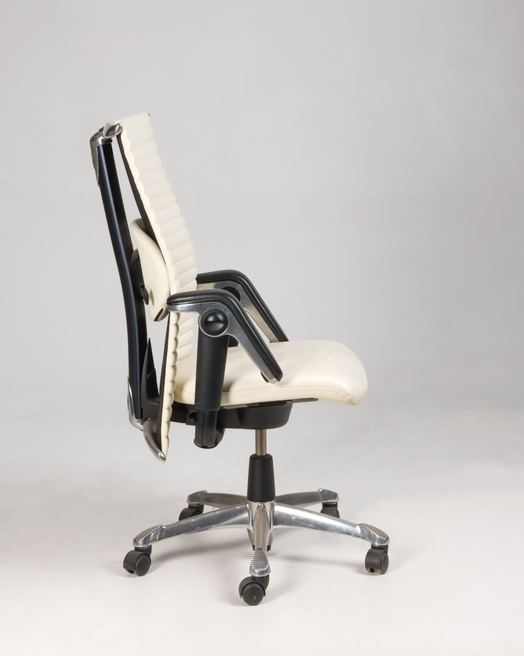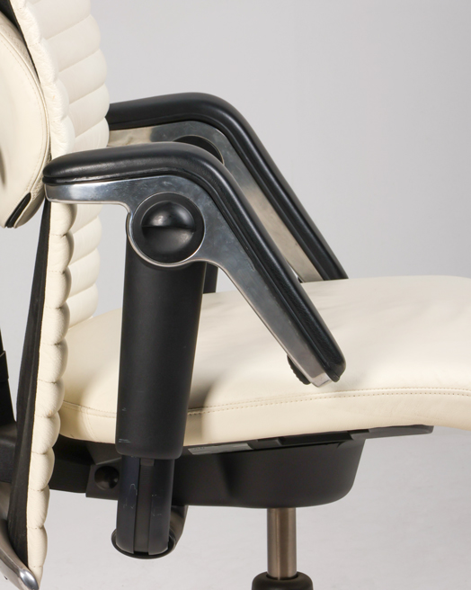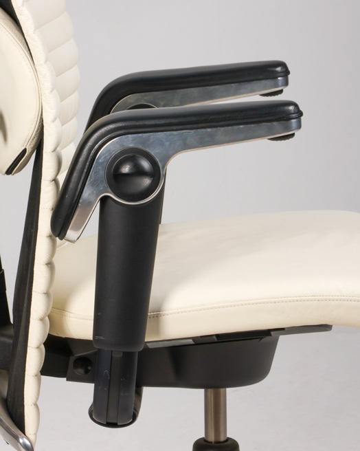 "HÅG Inspiration H09 konferencestol med ryg polstret med hvidt læder. En luksuriøs mødestol som har en høj grad af komfort med bl.a. de justerbare armlæn og lændestøtten.