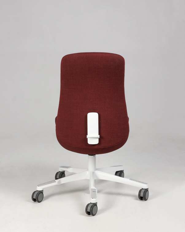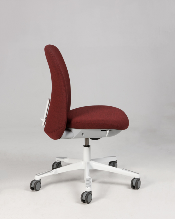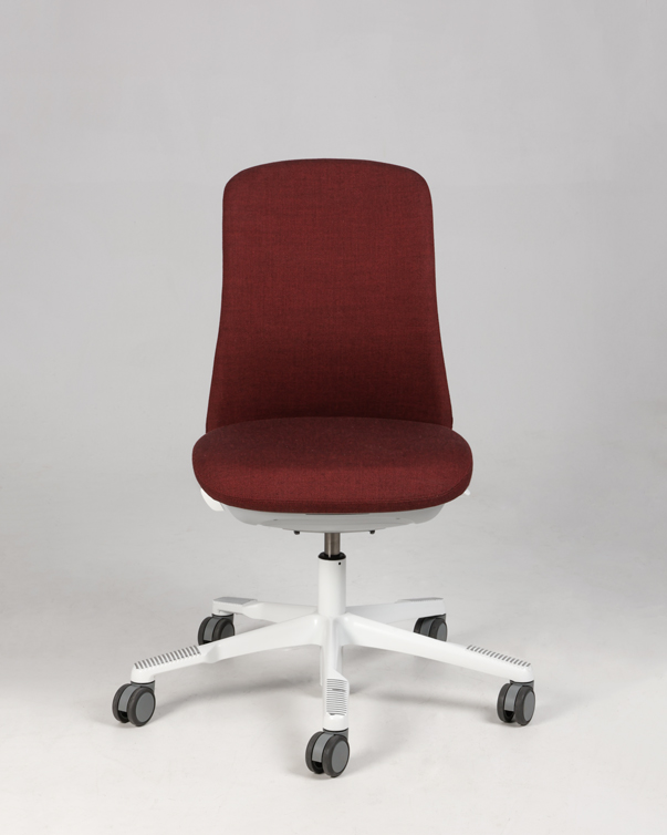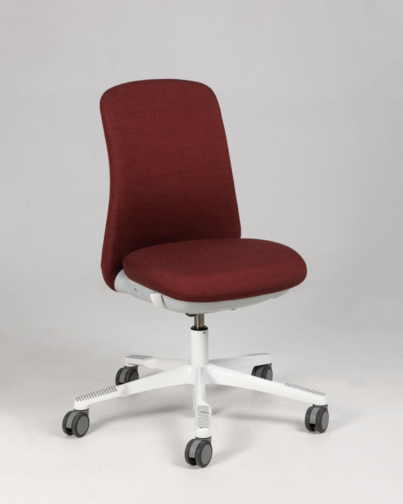 "HÅG SoFi 7200 kontorstol i meleret mørkerød med hvidt fodkryds. Sædedybderegulering og justerbar lændestøtte, er blot få af stolens mange forskellige funktioner, der giver brugeren mulighed for at tilpasse funktionerne sine behov for ergonomisk siddestilling og -komfort.