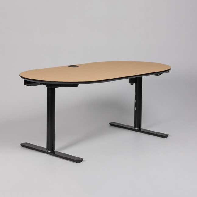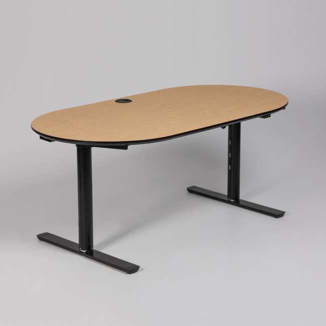 "Ovalt elektrisk hæve-sænkebord med bordplade i bambus med sort kant. Sort stel med runde ben samt kabelbakke til samling af ledninger under bordpladen.