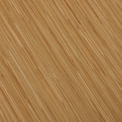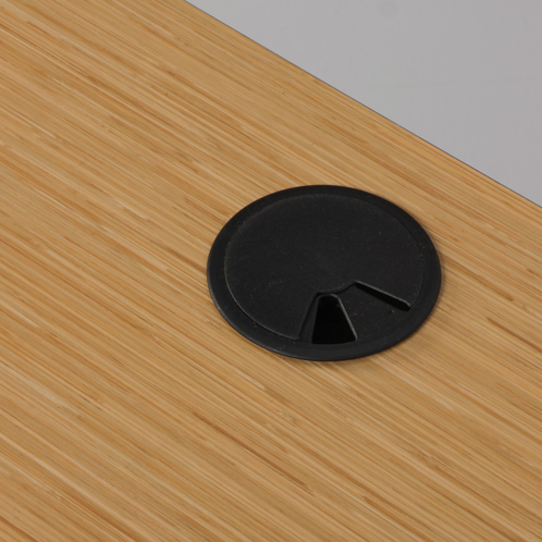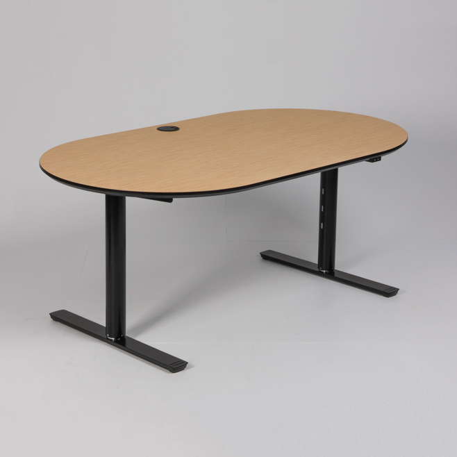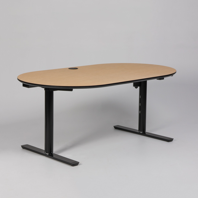 "Ovalt elektrisk hæve-sænkebord med bordplade i bambus med sort kant. Sort stel med runde ben samt kabelbakke til samling af ledninger under bordpladen.