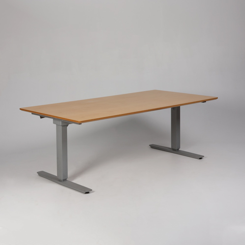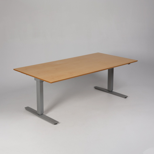"Elektrisk hæve sænkebord med birkefinéret bordplade med affasede kanter.