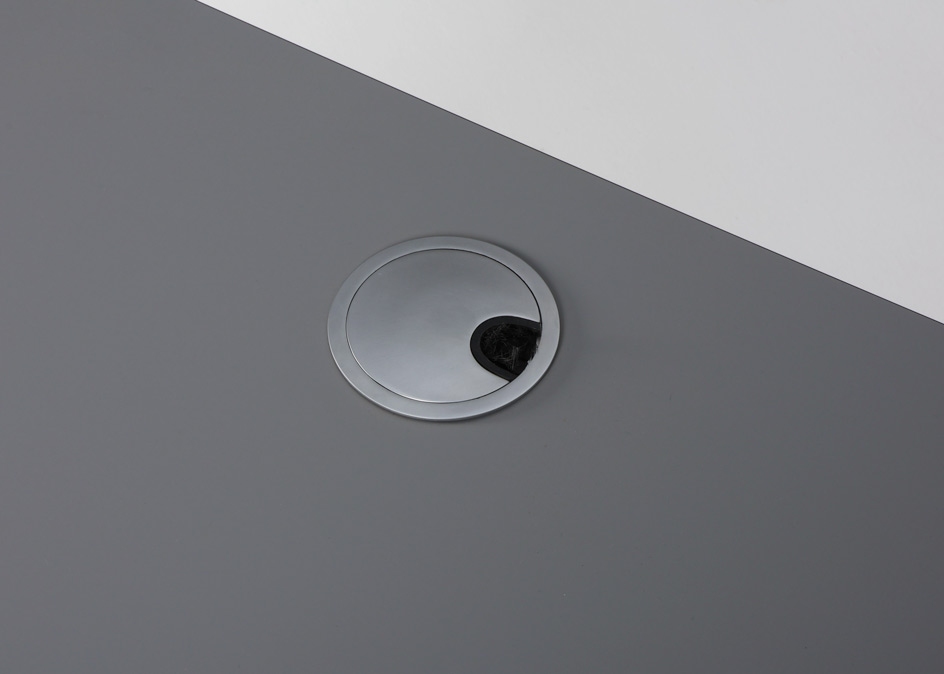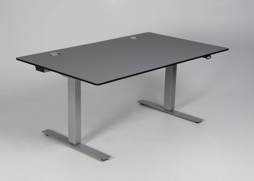 "Upcyclet hæve-sænkebord med fabriksny grå soft nano-laminat med affasede sorte kanter. Brugt stel der har to motorer og tre led, og giver mulighed for at justere højden fra 64-123 cm. I bordpladen er monteret to rosetter til kabelgennemføring og herunder kabelbakke der samler og holder orden på ledningerne.