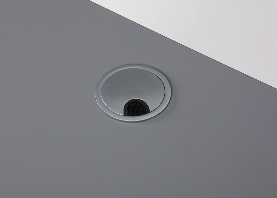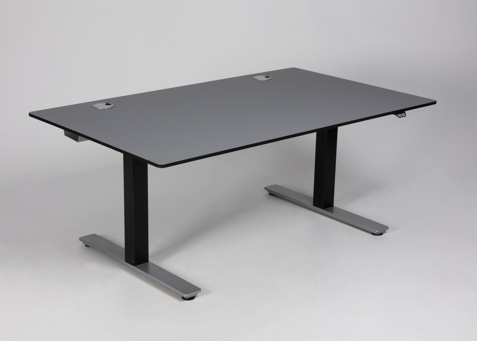 "Upcyclet hæve-sænkebord med fabriksny grå soft nano-laminat med affasede sorte kanter. Brugt stel med grå fødder der har to motorer og tre led, og giver mulighed for at justere højden fra 60-124 cm. I bordpladen er monteret to rosetter til kabelgennemføring og herunder kabelbakke der samler og holder orden på ledningerne.