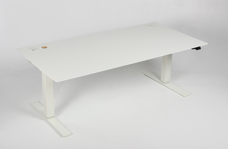 Elektrisk hæve-sænkebord med hvid laminatbordplade og kabelgennemføringer.