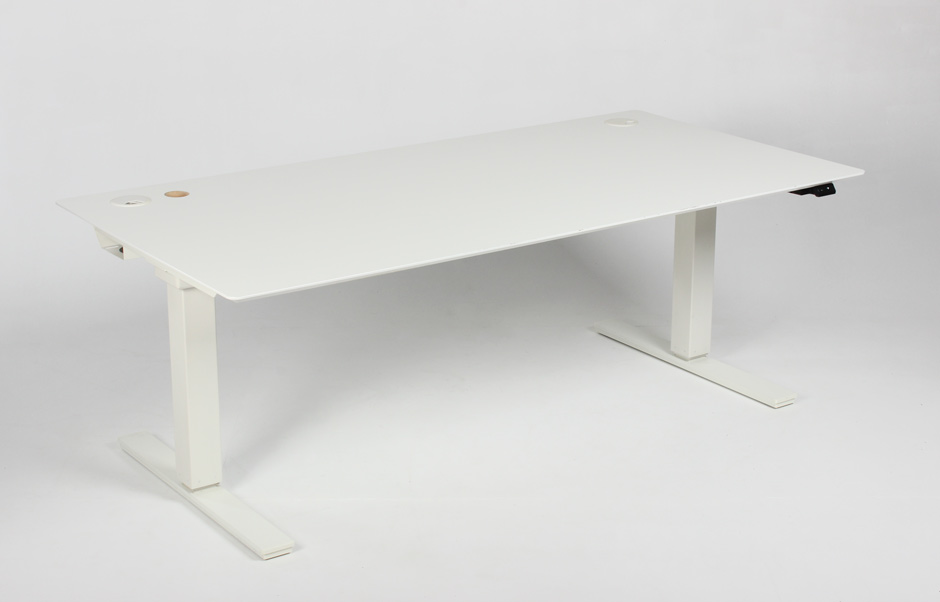 "Elektrisk hæve-sænkebord med hvid laminatbordplade og kabelgennemføringer.
