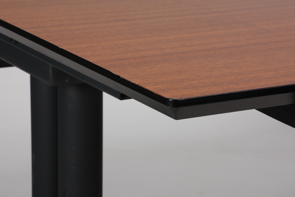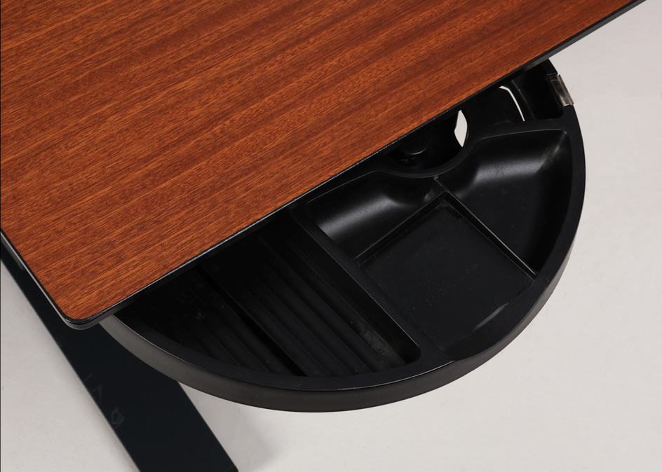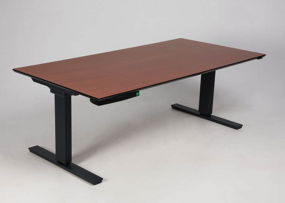 "Elektrisk hæve-sænkebord med kirsebærlamineret bordplade. Bordets sorte stel har to motorer og tre led, der giver mulighed for at justere højden fra 63-130 cm. Under bordpladen er monteret en svingbar pennebakke samt praktisk kabelbakke, der samler og holder styr på ledninger fra skærme og øvrigt elektronisk udstyr.