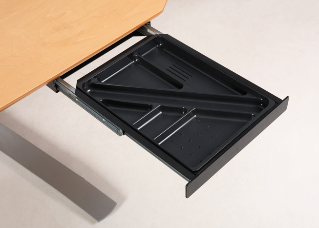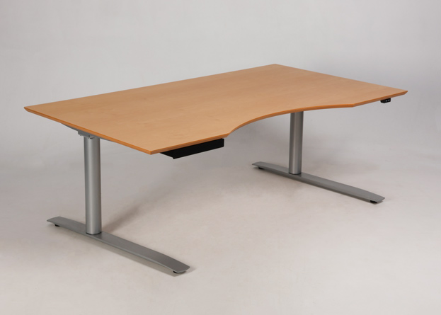 "Hæve sænkebord med mavebue i lakeret birkefiner og gråt stel. Med monteret udtræksskuffe til praktisk opbevaring af mindre kontorartikler.