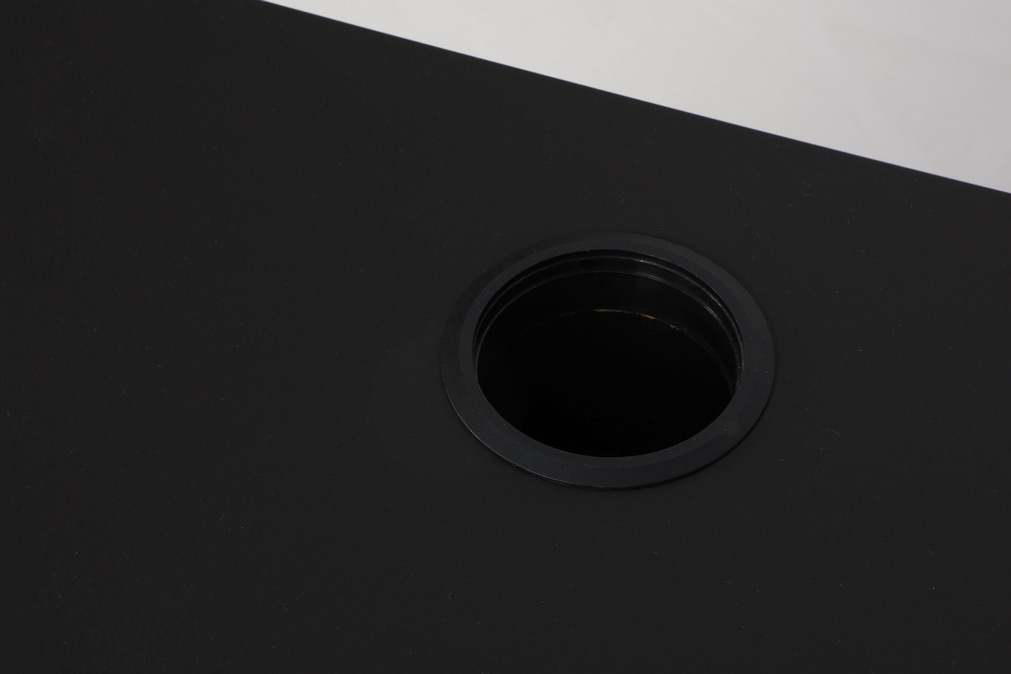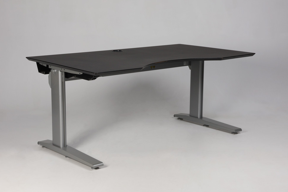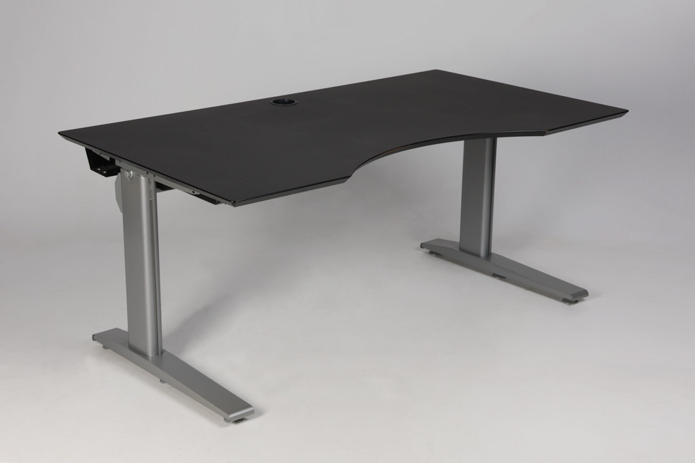 Hæve sænkebordet med sort linoleumsbordplade med mavebue og roset til kabelgennemføring. Gråt stel med to led, der giver mulighed for at tilpasse og variere arbejdshøjden. Under bordpladen er monteret en praktisk kabelbakke til samling og opbevaring af kabler.