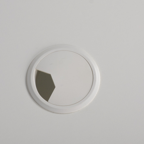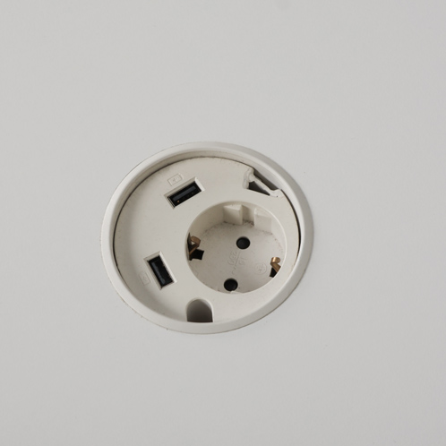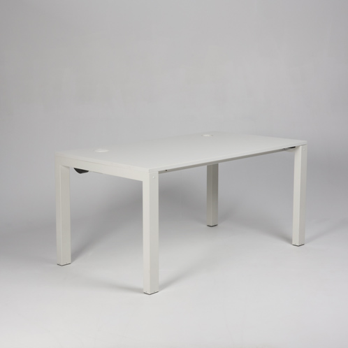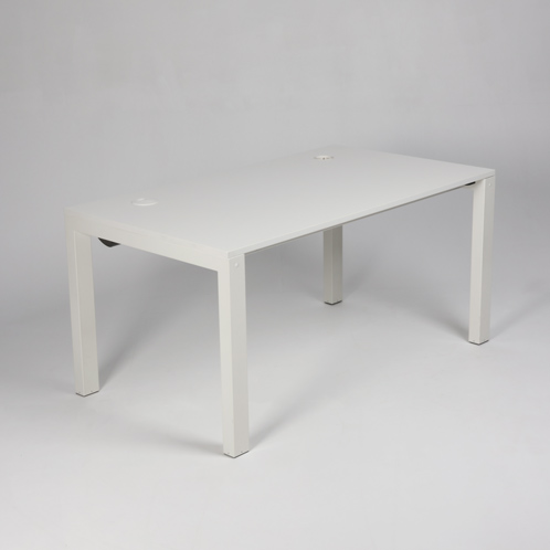"Hæve sænkebord i hvid laminatbordplade på 140 x 80 cm, kabelbakke og roset til kabelgennemføring. Bordplade med PowerDot i, herunder USB til opladning af mobilen.