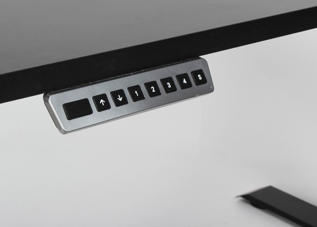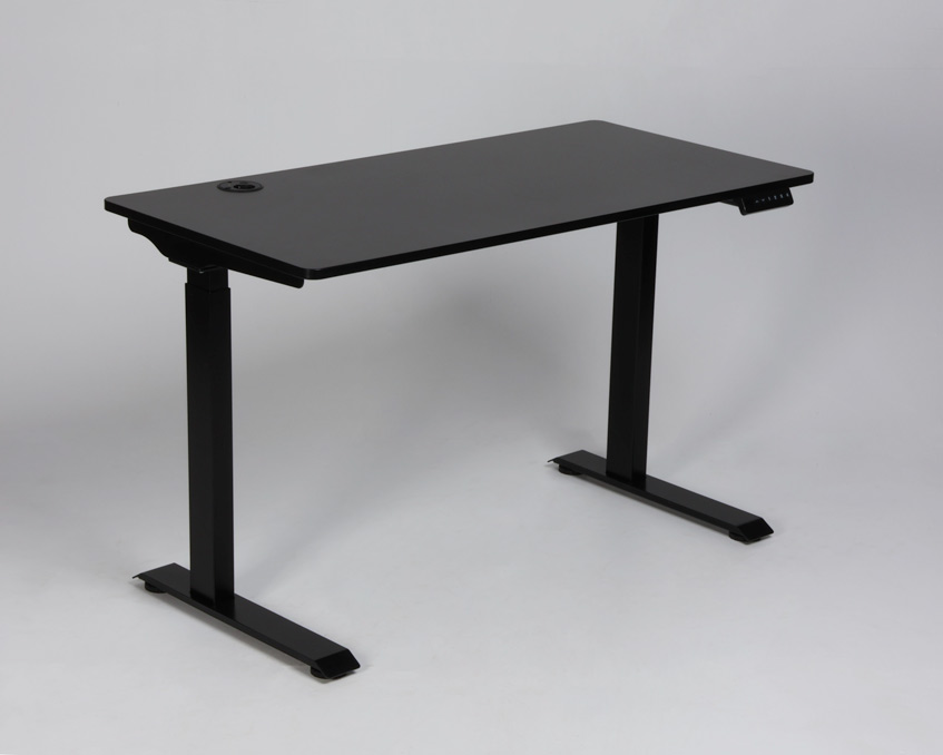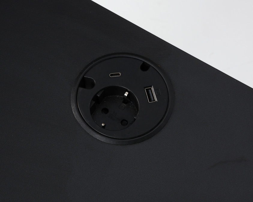 "Lille hæve sænkebord med en dybde på kun 60 cm. Bordplade i sort laminat med lige kanter og afrundede hjørner samt en powerdot, der bl.a. muliggør opladning af mobiltelefonen. Bordet er ekstraordinært smalt og har kabelbakke monteret til praktisk opbevaring af kabler fra PC og øvrigt udstyr. Perfekt valg til det mindre kontor!
